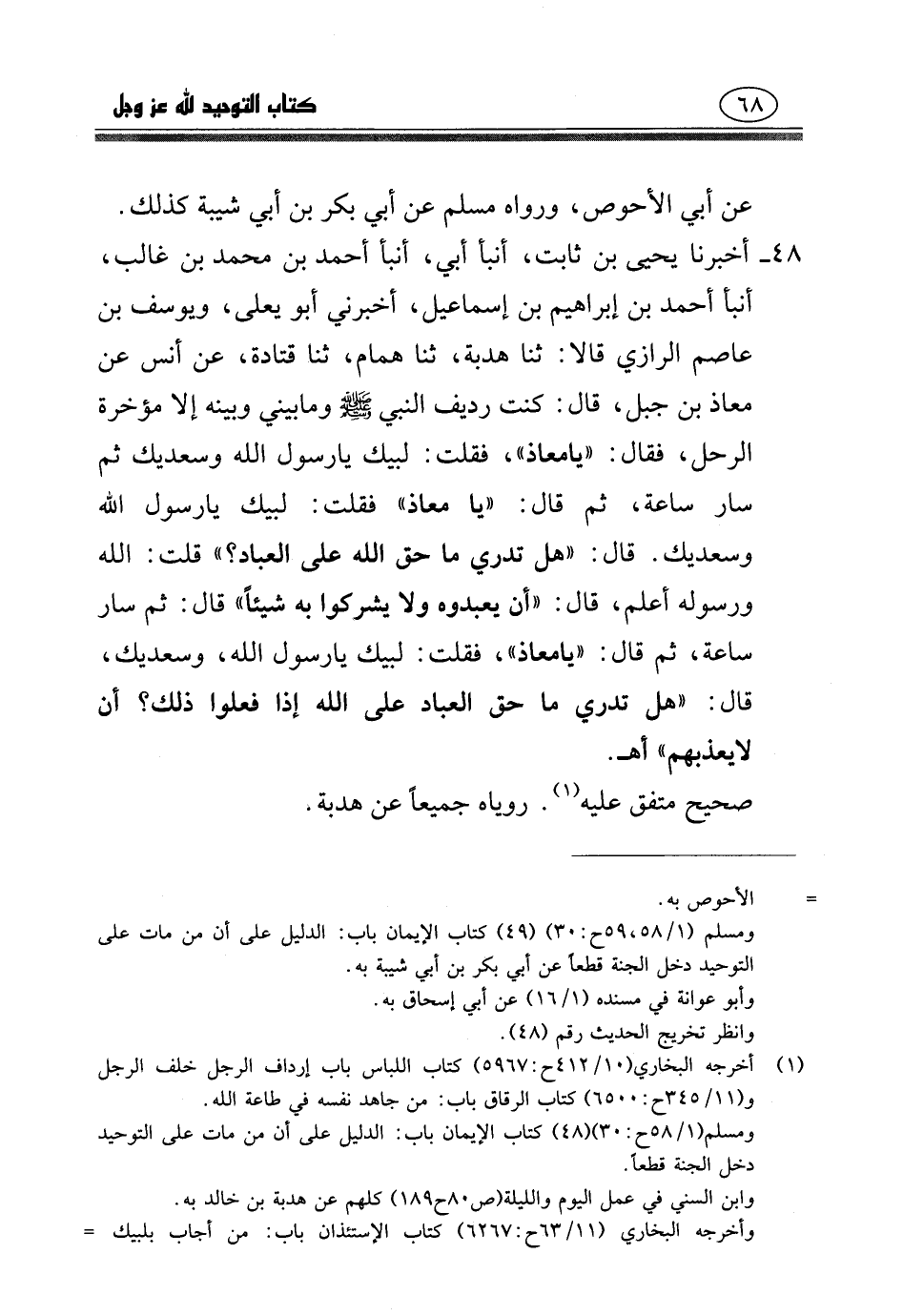 فَقُلْتُ: لَبَّيْكَ يَا رَسُولَ اللَّهِ وَسَعْدَيْكَ، قَالَ: «هَلْ تَدْرِي مَا حَقُّ اللَّهِ عَلَى الْعِبَادِ؟» قُلْتُ: اللَّهُ وَرَسُولُهُ أَعْلَمُ، قَالَ: «أَنْ يَعْبُدُوهُ وَلا يُشْرِكُوا بِهِ شَيْئًا» .