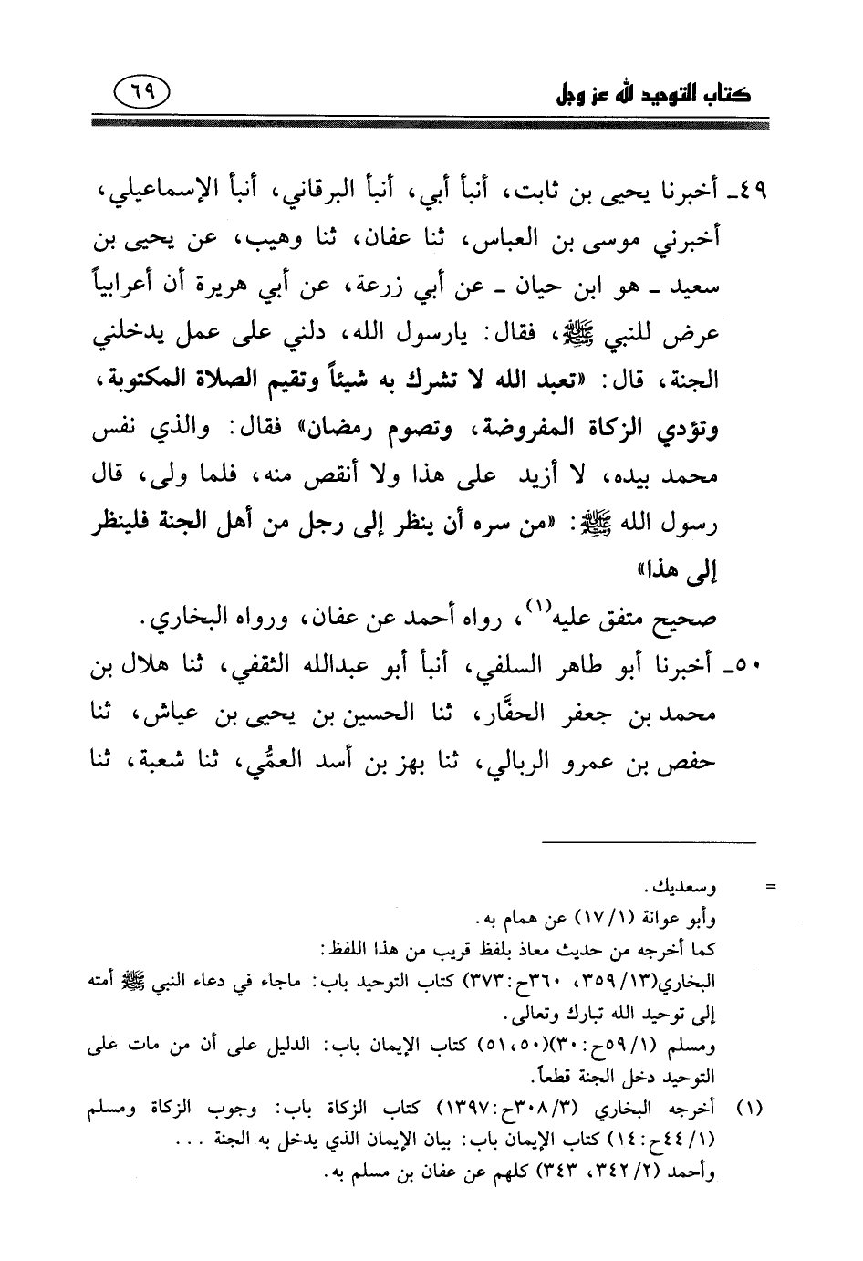 49 - أَخْبَرَنَا يَحْيَى بْنُ ثَابِتٍ، أنا أَبِي، أنبا الْبَرْقَانِيُّ، أنبا الإِسْمَاعِيلِيُّ، أَخْبَرَنِي مُوسَى بْنُ الْعَبَّاسِ، ثنا عَفَّانُ، ثنا وُهَيْبٌ، عَنْ يَحْيَى بْنِ سَعِيدٍ هُوَ ابْنُ حَيَّانَ، عَنْ أَبِي زُرْعَةَ، عَنْ أَبِي هُرَيْرَةَ: أَنَّ أَعْرَابِيًّا عَرَضَ لِلنَّبِيِّ صَلَّى اللَّهُ عَلَيْهِ وَسَلَّمَ، فَقَالَ: يَا رَسُولَ اللَّهِ، دُلَّنِي عَلَى عَمَلٍ يُدْخِلُنِي الْجَنَّةَ، قَالَ: «تَعْبُدُ اللَّهَ لا تُشْرِكُ بِهِ شَيْئًا، وَتُقِيمُ الصَّلاةَ الْمَكْتُوبَةَ، وَتُؤَدِّي الزَّكَاةَ الْمَفْرُوضَةَ، وَتَصُومُ رَمَضَانَ» .