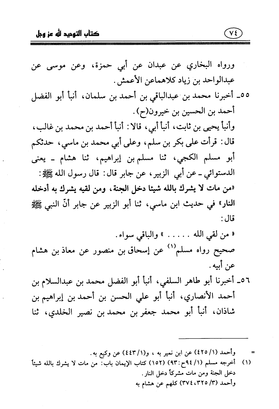 56 - أخبرنا أبو طاهر السلفي، أنبا أبو الفضل محمد بن عبد السلام بن أحمد الأنصاري، أنبا أبو علي الحسن بن أحمد بن إبراهيم بن شاذان، أنبا أبو محمد جعفر بن محمد بن نصير الخلدي، ثنا