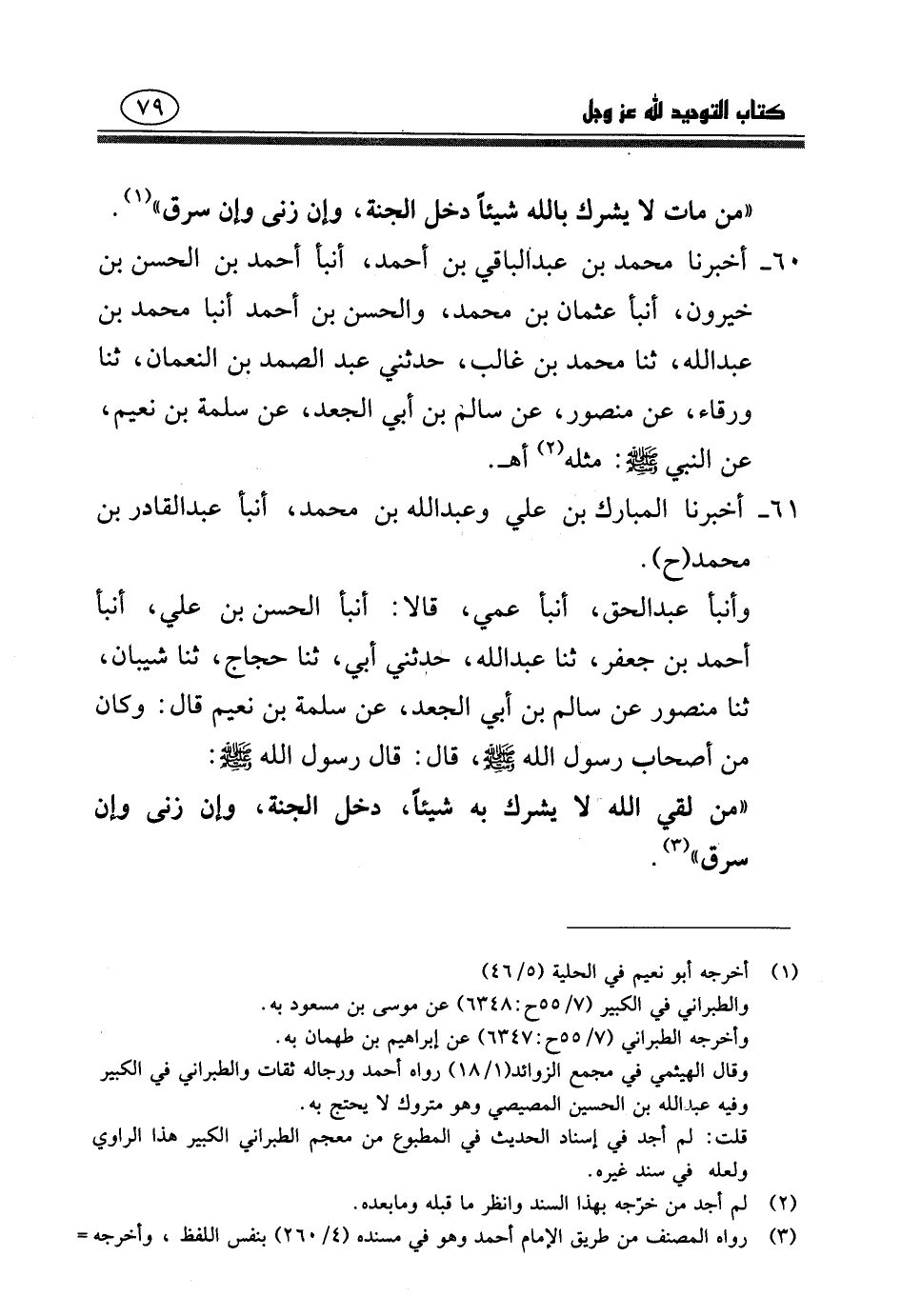 ح وأنبا عبد الحق، أنبا عمي، قالا: أنبا الحسن بن علي، أنبا أحمد بن جَعْفَر، ثنا عبد الله، حدثني أبي، ثنا حجاج، ثنا شيبان، عن منصور، عن سالم بن أبي الجعد، عن سلمة بن نعيم، قال: وكان من أصحاب رسول الله صلى الله عليه وسلم، قال: قَالَ رَسُولُ اللَّهِ صَلَّى اللَّهُ عَلَيْهِ وَسَلَّمَ: «مَنْ لَقِيَ اللَّهَ لا يُشْرِكُ بِهِ شَيْئًا دَخَلَ الْجَنَّةَ، وَإِنْ زَنَا، وَإِنْ سَرَقَ»