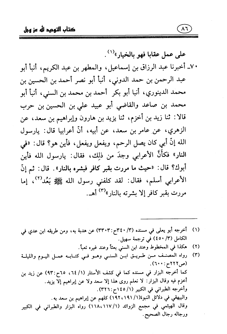 70 - أخبرنا عبد الرزاق بن إسماعيل، والمطهر بن عبد الكريم، أنبا أبو مُحَمَّد عبد الرحمن بن حمد الدوني، أنبا أبو نصر أحمد بن الحسين بن محمد الدينوري، أنبا أبو بكر أحمد بن محمد بن السني، أنبا أبو محمد بن صاعد، والقاضي أبو عبيد علي بن الحسن بن حرب، قالا: ثنا زيد بْن أخزم، ثنا يزيد بن هارون، وإبراهيم بن سعد، عن الزهري، عن عامر بن سعد، عن أبيه، أَنَّ أَعْرَابِيًّا قَالَ: يَا رَسُولَ اللَّهِ، إِنَّ أَبِي كَانَ يَصِلُ الرَّحِمَ، وَيَفْعَلُ، وَيَفْعَلُ، فَأَيْنَ هُوَ؟ قَالَ: «فِي النَّارِ» .
