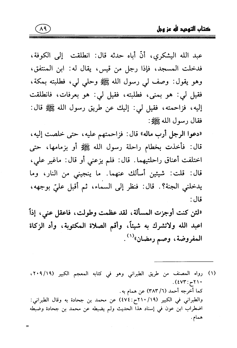 عبد الله اليشكري، أن أباه حدثه، قَالَ: انْطَلَقْتُ إِلَى الْكُوفَةِ، فَدَخَلْتُ الْمَسْجِدَ، فَإِذَا رَجُلٌ مِنْ قَيْسٍ، يُقَالُ لَهُ: ابْنُ الْمُنْتَفِقِ، وَهُوَ يَقُولُ: وُصِفَ لِي رَسُولُ اللَّهِ صَلَّى اللَّهُ عَلَيْهِ وَسَلَّمَ وَجَلِيَ لِي، فَطَلَبْتُهُ بِمَكَّةَ، فَقِيلَ لِي: هُوَ بِمِنًى، فَطَلَبْتُهُ، فَقِيلَ لِي: هُوَ بِعَرَفَاتٍ، فَانْطَلَقْتُ إِلَيْهِ، فَزَاحَمْتُهُ، فَقِيلَ لِي: إِلَيْكَ عَنْ طَرِيقِ رَسُولِ اللَّهِ صَلَّى اللَّهُ عَلَيْهِ وَسَلَّمَ، قَالَ: فَقَالَ رَسُولُ اللَّهِ صَلَّى اللَّهُ عَلَيْهِ وَسَلَّمَ: «دَعُوا الرَّجُلَ، أَرَبٌ، مَا لَهُ؟» قَالَ: فَزَاحَمْتُهُمْ عَلَيْهِ، حَتَّى خَلُصْتُ إِلَيْهِ، قَالَ: فَأَخَذْتُ بِخِطَامِ رَاحِلَةِ رَسُولِ اللَّهِ صَلَّى اللَّهُ عَلَيْهِ وَسَلَّمَ أَوْ بِزِمَامِهَا حَتَّى اخْتَلَفَتْ أَعْنَاقُ رَاحِلَتَيْهِمَا، قَالَ: فَلَمْ يَرُعْنِي، أَوْ قَالَ: مَا عِيرَ عَلَيَّ، قَالَ: قُلْتُ: شَيْئَيْنِ أَسْأَلُكَ عَنْهُمَا: مَا يُنَجِّينِي مِنَ النَّارِ؟ وَمَا يُدْخِلُنِي الْجَنَّةَ؟ قَالَ: فَنَظَرَ إِلَى السَّمَاءِ، ثُمَّ أَقْبَلَ عَلَيَّ بِوَجْهِهِ، قَالَ: «لَئِنْ كُنْتَ أَوْجَزْتَ الْمَسْأَلَةَ، لَقَدْ عَظُمَتْ وَطَوُلَتْ، فَأَعْقِلْ عَنِّي إِذًا، اعْبُدِ اللَّهَ وَلا تُشْرِكْ بِهِ شَيْئًا، وَأَقِمِ الصَّلاةَ الْمَكْتُوبَةَ، وَأَدِّ الزَّكَاةَ الْمَفْرُوضَةَ، وَصُمْ رَمَضَانَ»