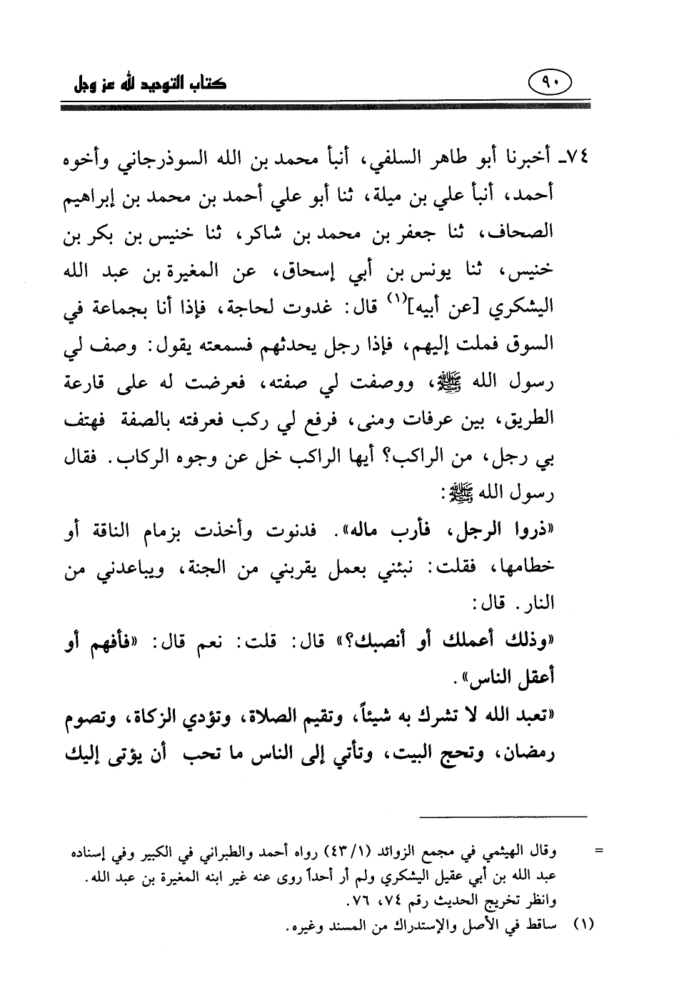 74 - أخبرنا أبو طاهر السلفي، أنبا محمد بن عبد الله السوذرجاني، وأخوه أحمد , أنبا ابن ميلة، ثنا أبو علي أحمد بن محمد بن إبراهيم الصحاف، ثنا جعفر بن محمد بن شاكر، نا خنيس بن بكر بْن خنيس، ثنا يونس بن أبي إسحاق، عَنِ الْمُغِيرَةِ بْنِ عَبْدِ اللَّهِ الْيَشْكُرِيِّ، قَالَ: غَدَوْتُ لِحَاجَةٍ، فَإِذَا أَنَا بِجَمَاعَةٍ فِي السُّوقِ، فَمِلْتُ إِلَيْهِمْ، فَإِذَا رَجُلٌ يُحَدِّثُهُمْ، فَسَمِعْتُهُ يَقُولُ: وُصِفَ لِي رَسُولُ اللَّهِ صَلَّى اللَّهُ عَلَيْهِ وَسَلَّمَ، وَوُصِفَ لِي صِفَتُهُ، فَعَرَضْتُ لَهُ عَلَى قَارِعَةِ الطَّرِيقِ بَيْنَ عَرَفَاتٍ وَمِنًى، فَرَفَعَ لِي رَكْبٌ، فَهَتَفَ بِي رَجُلٌ: مَنِ الرَّاكِبُ؟ أَيُّهَا الرَّاكِبُ خَلِّ عَنْ وُجُوهِ الرِّكَابِ، فَقَالَ رَسُولُ اللَّهِ صَلَّى اللَّهُ عَلَيْهِ وَسَلَّمَ: «ذَرُوا الرَّجُلَ، فَأَرَبٌ مَا لَهُ» .