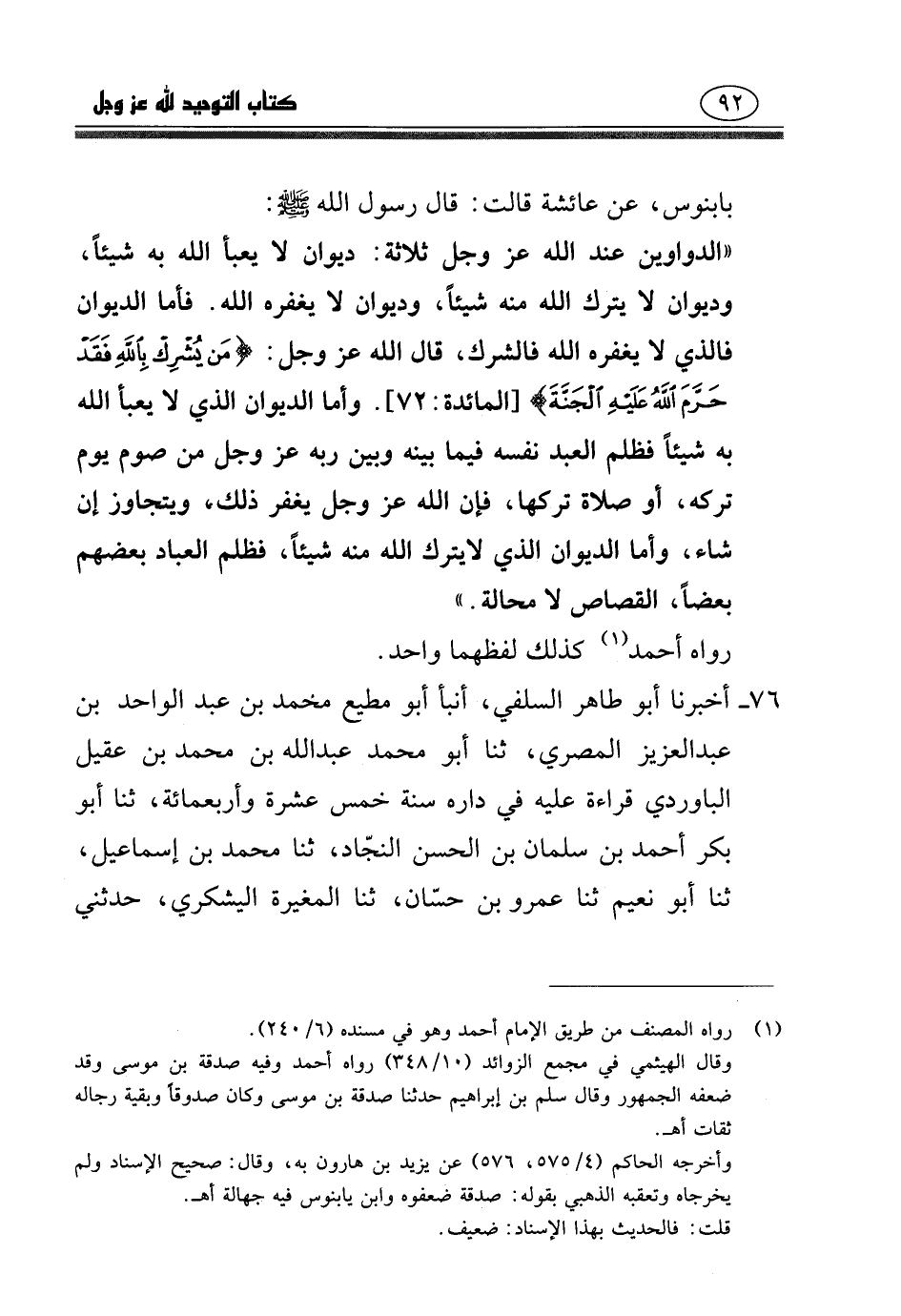 بابنوس، عن عائشة، قالت: قَالَ رَسُولُ اللَّهِ صَلَّى اللَّهُ عَلَيْهِ وَسَلَّمَ: " الدَّوَاوِينُ عِنْدَ اللَّهِ عَزَّ وَجَلَّ ثَلاثَةٌ: دِيوَانٌ لا يَعْبَأُ اللَّهُ بِهِ شَيْئًا، وَدِيوَانٌ لا يَتْرُكُ اللَّهُ مِنْهُ شَيْئًا، وَدِيوَانٌ لا يَغْفِرُهُ اللَّهُ، فَأَمَّا الدِّيوَانُ الَّذِي لا يَغْفِرُهُ اللَّهُ فَالشِّرْكُ، قَالَ اللَّهُ عَزَّ وَجَلَّ: {مَنْ يُشْرِكْ بِاللَّهِ فَقَدْ حَرَّمَ اللَّهُ عَلَيْهِ الْجَنَّةَ} [المائدة: 72] .