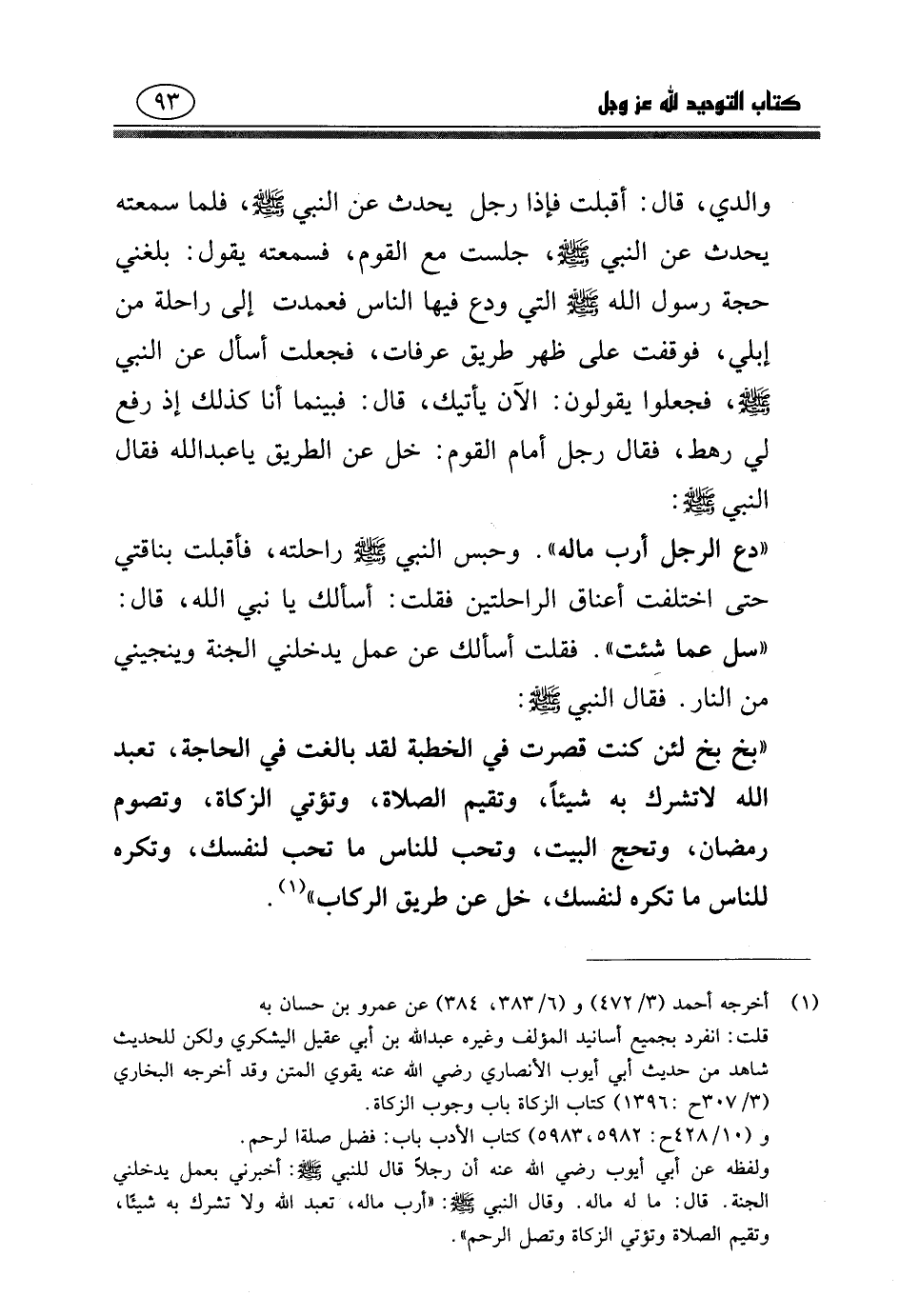 فَقُلْتُ: أَسْأَلُكَ عَنْ عَمَلٍ يُدْخِلُنِي الْجَنَّةَ، وَيُنْجِينِي مِنَ النَّارِ، فَقَالَ النَّبِيُّ صَلَّى اللَّهُ عَلَيْهِ وَسَلَّمَ: «بَخٍ بَخٍ، لَئِنْ كُنْتَ أَقْصَرْتَ فِي الْخُطْبَةِ، لَقَدْ بَالَغْتَ فِي الْحَاجَةِ، تَعْبُدُ اللَّهَ لا تُشْرِكُ بِهِ شَيْئًا، وَتُقِيمُ الصَّلاةَ، وَتُؤْتِي الزَّكَاةَ، وَتَصُومُ رَمَضَانَ، وَتَحُجُّ الْبَيْتَ، وَتُحِبُّ لِلنَّاسِ مَا تُحِبُّ لِنَفْسِكَ، وَتَكْرَهُ لِلنَّاسِ مَا تَكْرَهُ لِنَفْسِكَ، خَلِّ عَنْ طَرِيقِ الرِّكَابِ»