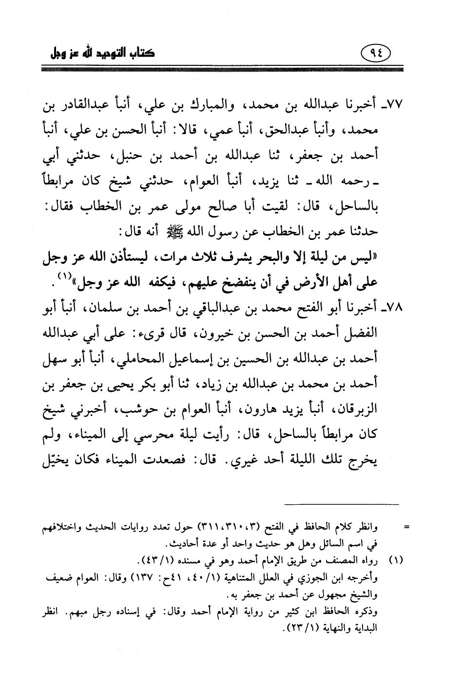 77 - أخبرنا عبد الله بن محمد، والمبارك بن علي، أنبا عبد القادر بن محمد، وأنبا عبد الحق، أنبا عمي، قالا: أنبا الحسن بن علي، أنا أحمد بن جعفر، نا عبد الله بن أحمد بن حنبل، حدثني أبي رحمه الله، ثنا يزيد، أنبا العوام، حدثني شيخ كان مرابطا بالساحل، قال: لقيت أبا صالح , مولى عمر بن الخطاب، فقال حدثنا عمر بن الخطاب، عَنْ رَسُولِ اللَّهِ صَلَّى اللَّهُ عَلَيْهِ وَسَلَّمَ: أَنَّهُ قَالَ: «لَيْسَ مِنْ لَيْلَةٍ إِلا وَالْبَحْرُ يُشْرِفُ ثَلاثَ مَرَّاتٍ لِيَسْتَأْذِنَ اللَّهَ عَزَّ وَجَلَّ عَلَى أَهْلِ الأَرْضِ فِي أَنْ يَنْفَضِخَ عَلَيْهِمْ، فَيَكُفُّهُ اللَّهُ عَزَّ وَجَلَّ»