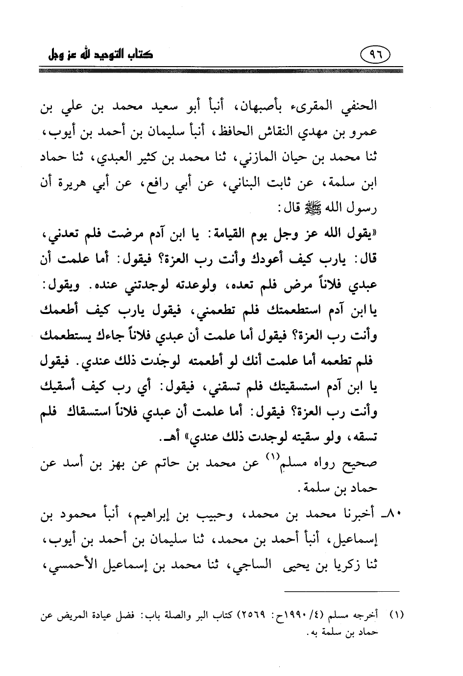 الحنفي المقرئ، بأصبهان، أنبا أبو سعيد محمد بن علي بن عمرو بن مهدي النقاش الحافظ، أنا سليمان بن أحمد بن أيوب، ثنا مُحَمَّد بن حيان المازني، ثنا محمد بن كثير العبدي، نا حماد بن سلمة، عن ثابت البناني، عن أبي رافع، عن أبي هريرة، أَنّ رَسُولَ اللَّهِ صَلَّى اللَّهُ عَلَيْهِ وَسَلَّمَ، قَالَ: يَقُولُ اللَّهُ عَزَّ وَجَلَّ يَوْمَ الْقِيَامَةِ: «يَا ابْنَ آدَمَ مَرِضْتُ فَلَمْ تَعُدْنِي» .