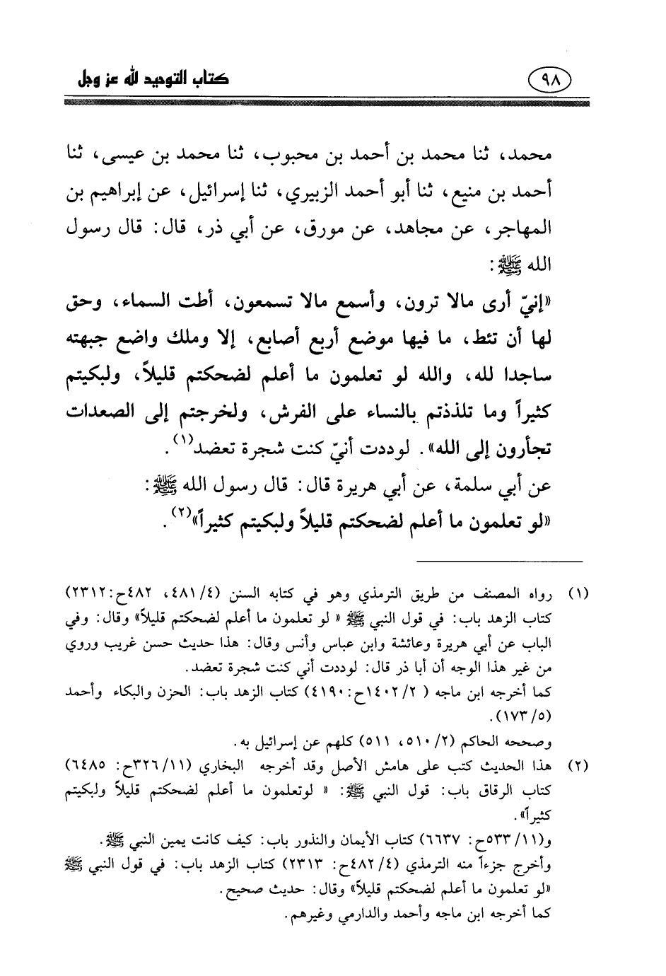 رواه أبو حفص عمرو بن علي. . . . . . عن أبي سلمة، عن أَبِي هريرة، قال، قَالَ رَسُولُ اللَّهِ صَلَّى اللَّهُ عَلَيْهِ وَسَلَّمَ: «لَوْ تَعْلَمُونَ مَا أَعْلَمُ لَضَحِكْتُمْ قَلِيلا وَلَبَكَيْتُمْ كَثِيرًا» .