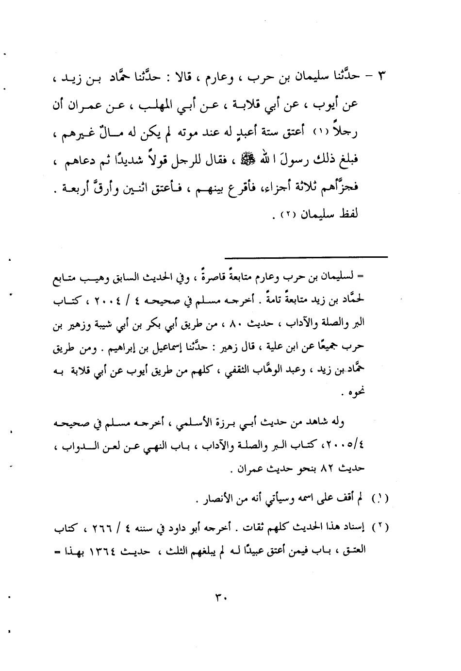 4 - حَدَّثَنَا سُلَيْمَانُ بْنُ حَرْبٍ، حَدَّثَنَا حَمَّادُ بْنُ زَيْدٍ، حَدَّثَنَا أَيُّوبُ، عَنْ -[32]- أَبِي قِلَابَةَ، عَنْ أَبِي الْمُهَلَّبِ، عَنْ عِمْرَانَ بْنِ الْحُصَيْنِ، قَالَ: §كَانَتِ الْعَضْبَاءُ لِرَجُلٍ مِنْ بَنِي عُقَيْلٍ وَكَانَتْ مِنْ سَوَابِقِ الْحَاجِّ فَأُسِرَ فَأَتَى عَلَيْهِ رَسُولُ اللهِ صَلَّى اللَّهُ عَلَيْهِ وَسَلَّمَ فِي وَثَاقٍ وَرَسُولُ اللهِ صَلَّى اللَّهُ عَلَيْهِ وَسَلَّمَ عَلَى حِمَارٍ عَلَيْهِ قَطِيفَةٌ فَقَالَ: يَا مُحَمَّدُ عَلَى مَا تَأْخُذُونِي وَتَأْخُذُونَ سَابِقَةَ الْحَاجِّ؟ قَالَ رَسُولُ اللهِ صَلَّى اللَّهُ عَلَيْهِ وَسَلَّمَ: " نَأْخُذُكَ بِجَرِيرَةِ حُلَفَائِكَ ثَقِيفٍ " قَالَ: وَكَانَتْ ثَقِيفٌ قَدْ أَسَرُوا رَجُلَيْنِ مِنْ أَصْحَابِ رَسُولِ اللهِ صَلَّى اللَّهُ عَلَيْهِ وَسَلَّمَ قَالَ: وَقَالَ: أَنَا مُسْلِمٌ