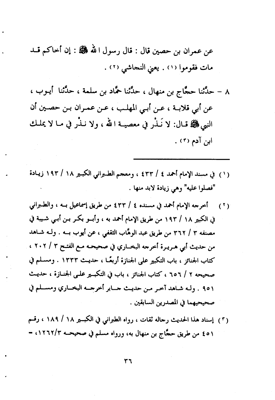9 - حَدَّثَنَا حَجَّاجُ بْنُ مِنْهَالٍ، حَدَّثَنَا حَمَّادُ بْنُ سَلَمَةَ، حَدَّثَنَا أَيُّوبُ، عَنْ أَبِي قِلَابَةَ، عَنْ أَبِي الْمُهَلَّبِ، عَنْ عِمْرَانَ بْنِ حُصَيْنٍ، أَنَّ رَسُولَ اللهِ صَلَّى اللَّهُ عَلَيْهِ وَسَلَّمَ §كَانَ فِي سَفَرٍ فَلَعَنَتِ امْرَأَةٌ نَاقَةً لَهَا فَقَالَ النَّبِيُّ صَلَّى اللَّهُ عَلَيْهِ وَسَلَّمَ: " أَلْقُوا عَنْهَا جِهَازَهَا فَإِنَّهَا مَلْعُونَةٌ " قَالَ: فَأُلْقِيَ عَنْهَا جِهَازُهَا كَأَنِّي أَنْظُرُ إِلَيْهَا نَاقَةً وَرْقَاءَ