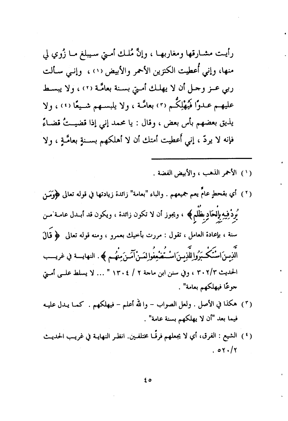 19 - حَدَّثَنَا بِهِ سُلَيْمَانُ بْنُ حَرْبٍ، حَدَّثَنَا حَمَّادُ بْنُ زَيْدٍ، حَدَّثَنَا أَيُّوبُ، عَنْ أَبِي قِلَابَةَ، عَنْ أَبِي أَسْمَاءَ، عَنْ ثَوْبَانَ، قَالَ: قَالَ رَسُولُ اللهِ صَلَّى اللَّهُ عَلَيْهِ وَسَلَّمَ: قَالَ: " أُزْوِيَ، أَوْ قَالَ: " إِنَّ §اللهَ عَزَّ وَجَلَّ زَوَى لِي الْأَرْضَ، فَرَأَيْتُ مَشَارِقَهَا وَمَغَارِبَهَا وَإِنَّ مُلْكَ أُمَّتِي سَيَبْلُغُ مَا زُوِيَ لِي مِنْهَا وَأُعْطِيتُ الْكَنْزَيْنِ الْأَحْمَرَ وَالْأَبْيَضَ وَإِنِّي سَأَلْتُ رَبِّي عَزَّ وَجَلَّ لِأُمَّتِي أَنْ لَا يُهْلِكَهَا بِسَنَةٍ بِعَامَّةٍ وَلَا يُسَلَّطَ عَلَيْهِمْ عَدُوًّا مِنْ سِوَى أَنْفُسِهِمْ فَيَسْتَبِيحَ بَيْضَتَهُمْ وَإِنَّ رَبِّي عَزَّ -[47]- وَجَلَّ قَالَ لِي: يَا مُحَمَّدُ إِنِّي قَضَيْتُ قَضَاءً فَإِنَّهُ لَا يُرَدُّ وَلَا أُهْلِكُهُمْ بِسَنَةٍ عَامَّةٍ وَلَا أُسَلِّطُ عَلَيْهِمْ عَدُوًّا مِنْ سِوَى أَنْفُسِهِمْ فَيَسْتَبِيحَ بَيْضَتَهُمْ وَلَوِ اجْتَمَعَ عَلَيْهِمْ مَنْ بَيْنَ أَقْطَارِهَا، أَوْ قَالَ: مَنْ بِأَقْطَارِهَا، حَتَّى يَكُونَ بَعْضُهُمْ يُسْبِي بَعْضًا وَيَكُونَ بَعْضُهُمْ يُهْلِكُ بَعْضًا وَإِنِّي أَخَافُ عَلَى أُمَّتِي الْأَئِمَّةَ الْمُضِلِّينَ، وَإِذَا وُضِعَ السَّيْفُ فِي أُمَّتِي لَمْ يُرْفَعْ عَنْهُمْ إِلَى يَوْمِ الْقِيَامَةِ، وَلَا تَقُومُ السَّاعَةُ حَتَّى تَلْحَقَ قَبَائِلُ مِنْ أُمَّتِي بِالْمُشْرِكِينَ وَحَتَّى تَعْبُدَ قَبَائِلُ مِنْ أُمَّتِي الْأَوْثَانَ وَأَنَّهُ سَيَكُونُ فِي أُمَّتِي كَذَّابُونَ -[48]- ثَلَاثُونَ كُلُّهُمْ يَزْعُمُ أَنَّهُ نَبِيٌّ وَأَنَا خَاتَمُ النَّبِيِّينَ لَا نَبِيَّ بَعْدِي وَلَا تَزَالُ طَائِفَةٌ مِنْ أُمَّتِي عَلَى الْحَقِّ ظَاهِرِينَ لَا يَضُرُّهُمْ مَنْ خَالَفَهُمْ حَتَّى يَأْتِيَ أَمْرُ اللهِ عَزَّ وَجَلَّ "