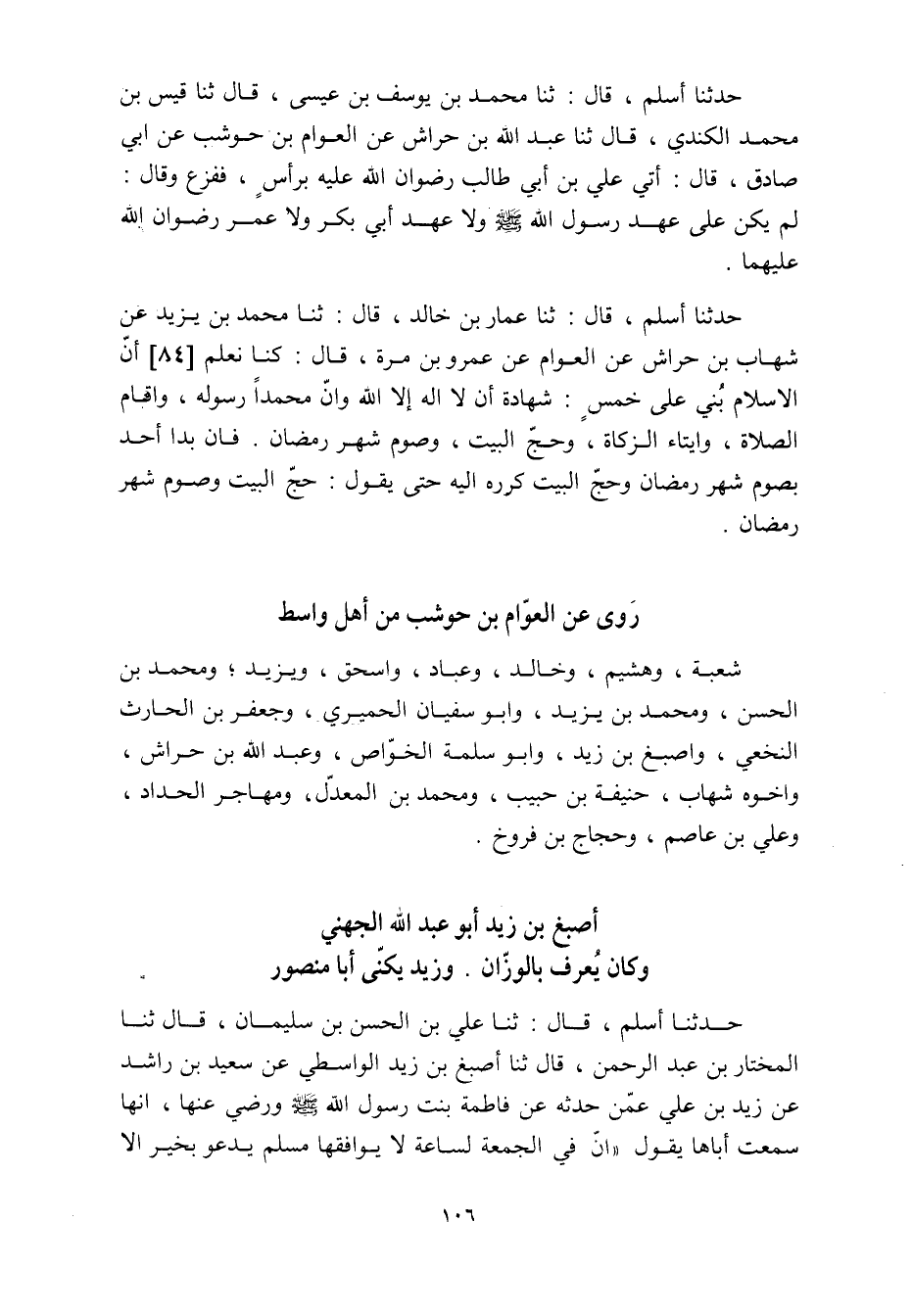 حدثنا أسلم، قال: ثنا عمار بن خالد، قال: ثنا مُحَمَّدُ بْنُ يَزِيدَ عَنْ شِهَابِ بْنِ حِرَاشٍ عَنِ الْعَوَّامِ عَنْ عَمْرِو بْنِ مُرَّةَ، قَالَ: كُنَّا نُعَلِّمُ [84] أَنَّ الإِسْلامَ بُنِيَ عَلَى خَمْسٍ: شهادة أن لا إله إلا الله وأن مُحَمَّدًا رَسُولُهُ، وَإِقَامِ الصَّلاةِ، وَإِيتَاءِ الزَّكَاةِ، وَحَجِّ الْبَيْتِ، وَصَوْمِ شَهْرِ رَمَضَانَ. فَإِنْ بَدَأَ أَحَدٌ بصوم شَهْرِ رَمَضَانَ وَحَجِّ الْبَيْتِ كَرَّرَهُ إِلَيْهِ حَتَّى يَقُولَ: حَجِّ الْبَيْتِ وَصَوْمِ شَهْرِ رَمَضَانَ.