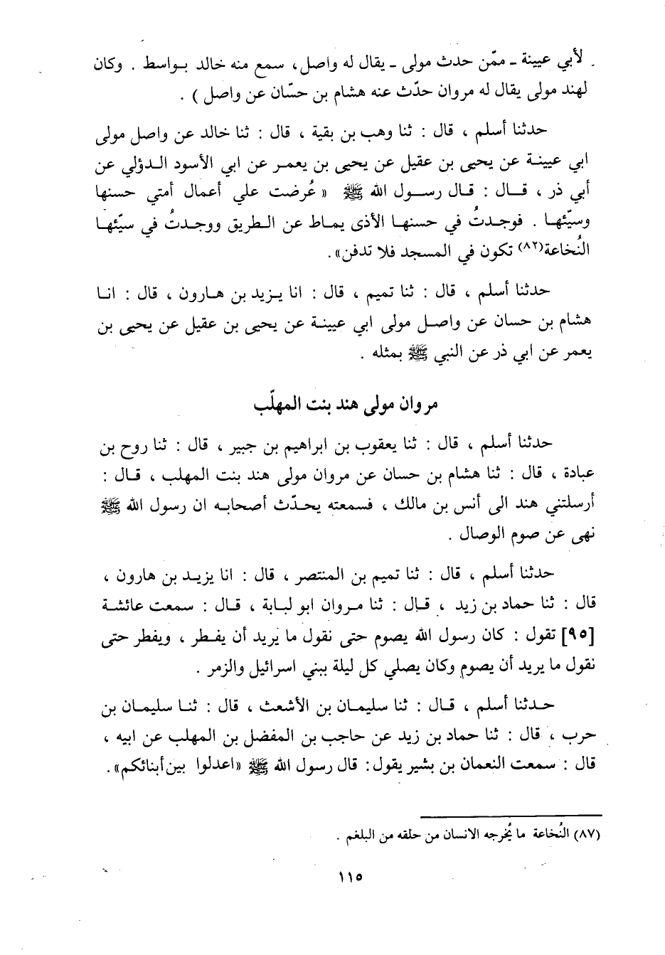 حدثنا أسلم، قال: ثنا وهب بن بقية، قال: ثنا خَالِدٌ عَنْ وَاصِلٍ مَوْلَى أَبِي عُيَيْنَةَ عَنْ يحيى بن عقيل عن يحيى بن يعمر عَنْ أَبِي الأَسْوَدِ الدُّؤَلِيِّ عَنْ أَبِي ذَرٍّ، قَالَ: قَالَ رَسُولُ اللَّهِ صَلَّى اللَّهُ عَلَيْهِ وَسَلَّمَ «عُرِضَتْ عَلَيَّ أَعْمَالُ أُمَّتِي حَسَنُهَا وَسَيِّئُهَا. فَوَجَدْتُ فِي حَسَنِهَا الأَذَى يُمَاطُ عَنِ الطَّرِيقِ وَوَجَدْتُ فِي سَيِّئِهَا النُّخَاعَةَ «82»