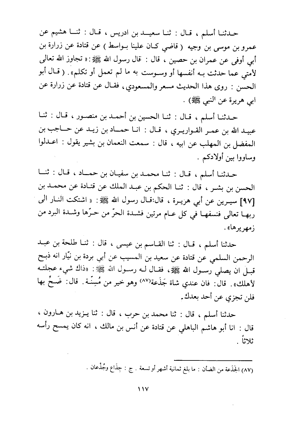 حدثنا أسلم، قال: ثنا سعيد بن إدريس، قال: ثنا هُشَيْمٌ عَنْ عَمْرِو بْنِ مُوسَى بْنِ وَجِيهٍ (قاضي كَانَ عَلَيْنَا بِوَاسِطٍ) عَنْ قَتَادَةَ عَنْ زُرَارَةَ بْنِ أَبِي أَوْفَى عَنْ عِمْرَانَ بْنِ حُصَيْنٍ، قَالَ: قَالَ رَسُولُ اللَّهِ صَلَّى اللَّهُ عَلَيْهِ وَسَلَّمَ: «تَجَاوَزَ اللَّهُ تَعَالَى لأُمَّتِي عَمَّا حَدَّثَتْ بِهِ أَنْفُسَهَا أَوْ وَسْوَسَتْ بِهِ مَا لَمْ تَعْمَلْ أَوْ تَكَلَّمْ» . (قَالَ أَبُو الْحَسَنِ: رَوَى هَذَا الْحَدِيثَ مِسْعَرٌ وَالْمَسْعُودِيُّ، فَقَالَ عَنْ قَتَادَةَ عَنْ زُرَارَةَ عَنْ أَبِي هُرَيْرَةَ عَنِ النَّبِيِّ صلى الله عليه وسلم) .