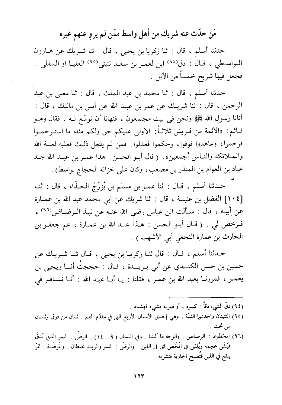 حدثنا أسلم، قَالَ: ثنا عُمَرُ بْنُ مُسْلِمِ بْنِ بُزُرْجَ الْحَذَّاءُ، قَالَ: ثنا [104] الْفَضْلُ بْنُ عَنْبَسَةَ، قَالَ: ثنا شَرِيكٌ عَنْ أَبِي مُحَمَّدٍ عَبْدُ اللَّهِ بْنِ عُمَارَةَ عَنْ أَبِيهِ، قَالَ: سَأَلْتُ ابْنَ عباس رضي الله عنه عن نبيذ الرضاض «96» ، فَرَخَّصَ لِي. (قَالَ أَبُو الْحَسَنِ: هَذَا عَبْدُ اللَّهِ بْنُ عُمَارَةَ، عَمُّ جَعْفَرِ بْنِ الْحَارِثِ بن عمارة النخعي أبي الأشهب) .