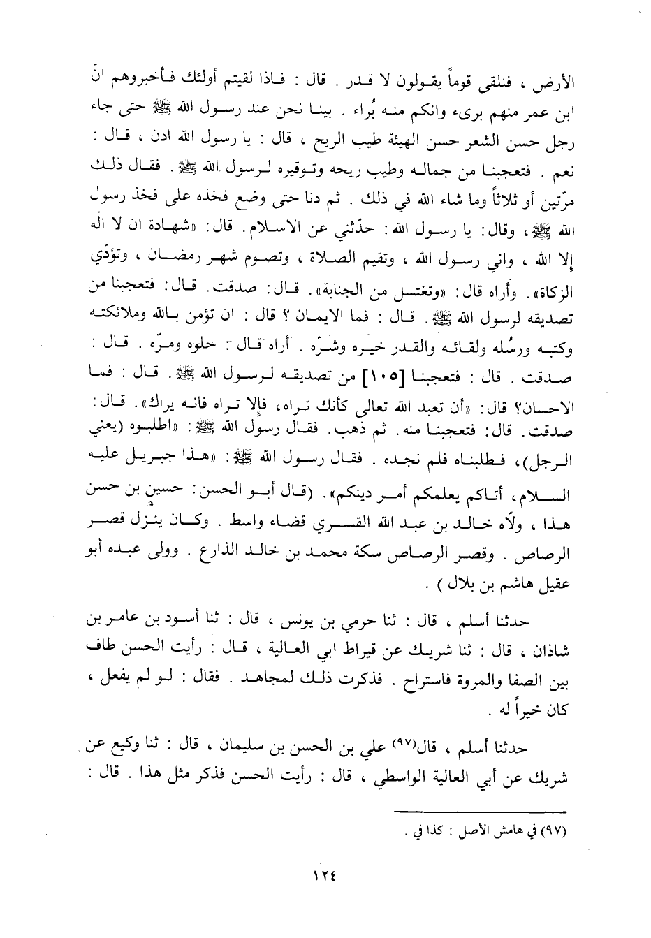 صَدَقْتَ. قَالَ: فَتَعَجَّبْنَا مِنْهُ. ثُمَّ ذَهَبَ. فَقَالَ رَسُولُ اللَّهِ صَلَّى اللَّهُ عَلَيْهِ وَسَلَّمَ: «اطْلُبُوهُ (يَعْنِي الرَّجُلَ) ، فَطَلَبْنَاهُ فَلَمْ نَجِدْهُ. فَقَالَ رَسُولُ اللَّهِ صَلَّى اللَّهُ عَلَيْهِ وَسَلَّمَ: «هَذَا جِبْرِيلُ عَلَيْهِ السَّلامُ، أَتَاكُمْ يُعَلِّمُكُمْ أَمْرَ دِينِكُمْ» . (قَالَ أَبُو الْحَسَنِ: حُسَيْنُ بْنُ حَسَنٍ هَذَا، وَلاهُ خَالِدُ بْنُ عَبْدِ اللَّهِ الْقَسْرِيُّ قَضَاءَ وَاسِطٍ. وَكَانَ يَنْزِلُ قَصْرَ الرَّصَاصِ. وَقَصْرُ الرَّصَاصِ سِكَّةُ مُحَمَّدِ بْنِ خَالِدٍ الذارع. وَوَلِيَ عَبْدُهُ أَبُو عَقِيلٍ هَاشِمُ بْنُ بِلالٍ) .