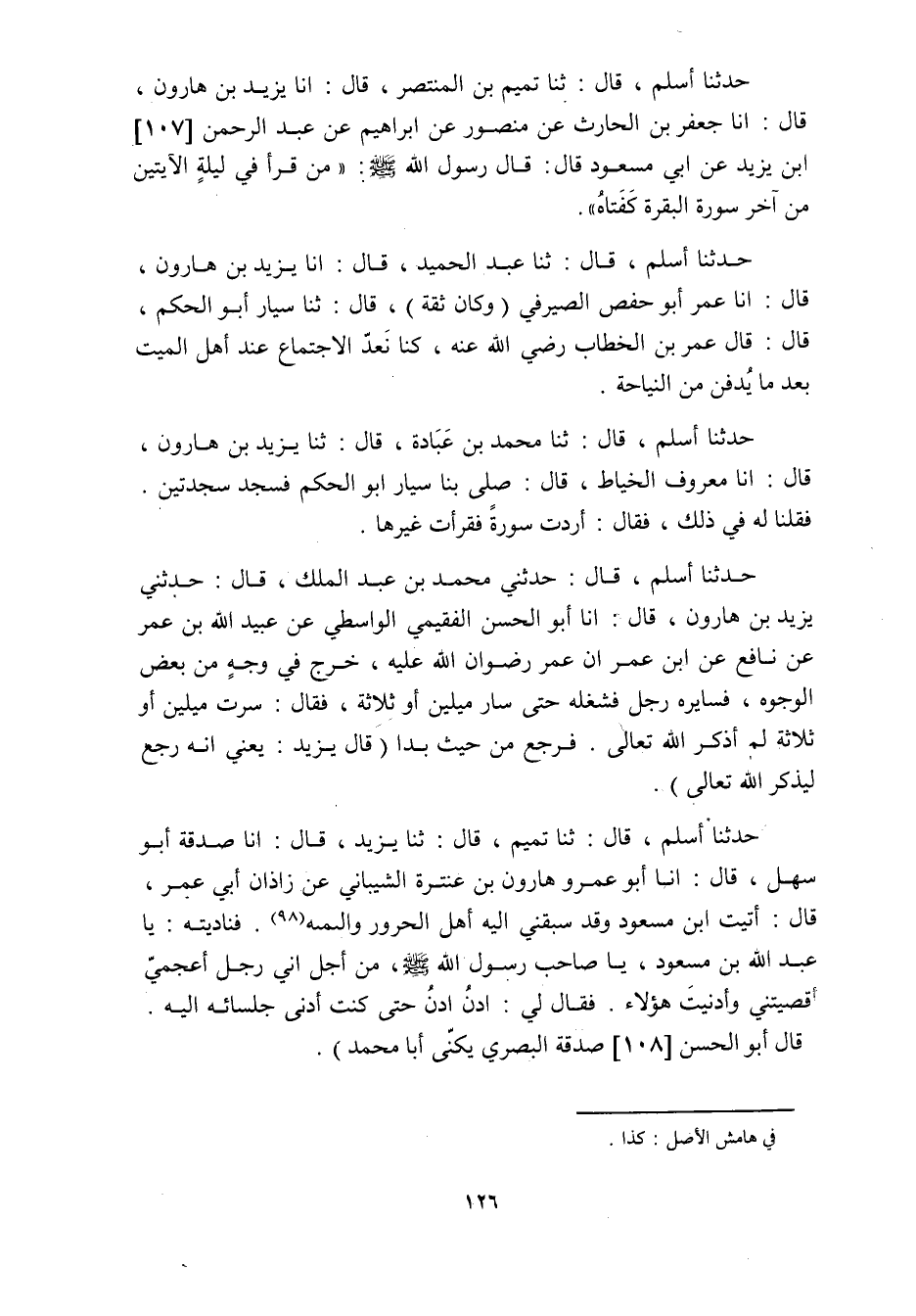 حدثنا أسلم، قال: ثنا تميم بن المنتصر، قال: أنا يَزِيدُ بْنُ هَارُونَ، قَالَ: أنا جَعْفَرُ بْنُ الْحَارِثِ عَنْ مَنْصُورٍ عَنْ إِبْرَاهِيمَ عَنْ عَبْدِ الرحمن [107] ابن يَزِيدَ عَنْ أَبِي مَسْعُودٍ قَالَ: قَالَ رَسُولُ اللَّهِ صَلَّى اللَّهُ عَلَيْهِ وَسَلَّمَ: «مَنْ قَرَأَ فِي لَيْلَةٍ الآيَتَيْنِ مِنْ آخِرِ سُورَةِ الْبَقَرَةِ كفتاه» .