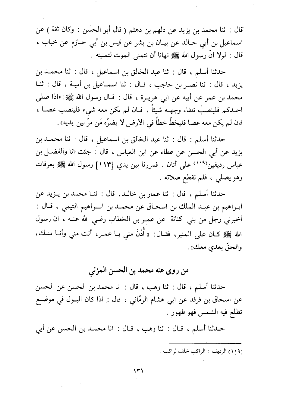 حدثنا أسلم: قَالَ: ثنا عَبْدُ الْخَالِقِ بْنُ إِسْمَاعِيلَ، قَالَ: ثنا مُحَمَّدُ بْنُ يَزِيدَ عَنْ أَبِي الْحَسَنِ عَنْ عَطَاءٍ عَنِ ابْنِ الْعَبَّاسِ، قَالَ: جِئْتُ أَنَا وَالْفَضْلُ بْنُ عَبَّاسٍ رَدِيفَيْنِ «109» عَلَى أَتَانٍ. فَمَرَرْنَا بَيْنَ يَدَيْ [113] رَسُولِ اللَّهِ صَلَّى اللَّهُ عَلَيْهِ وَسَلَّمَ بِعَرَفَاتٍ وَهُوَ يُصَلِّي، فَلَمْ نَقْطَعْ صلاته.
