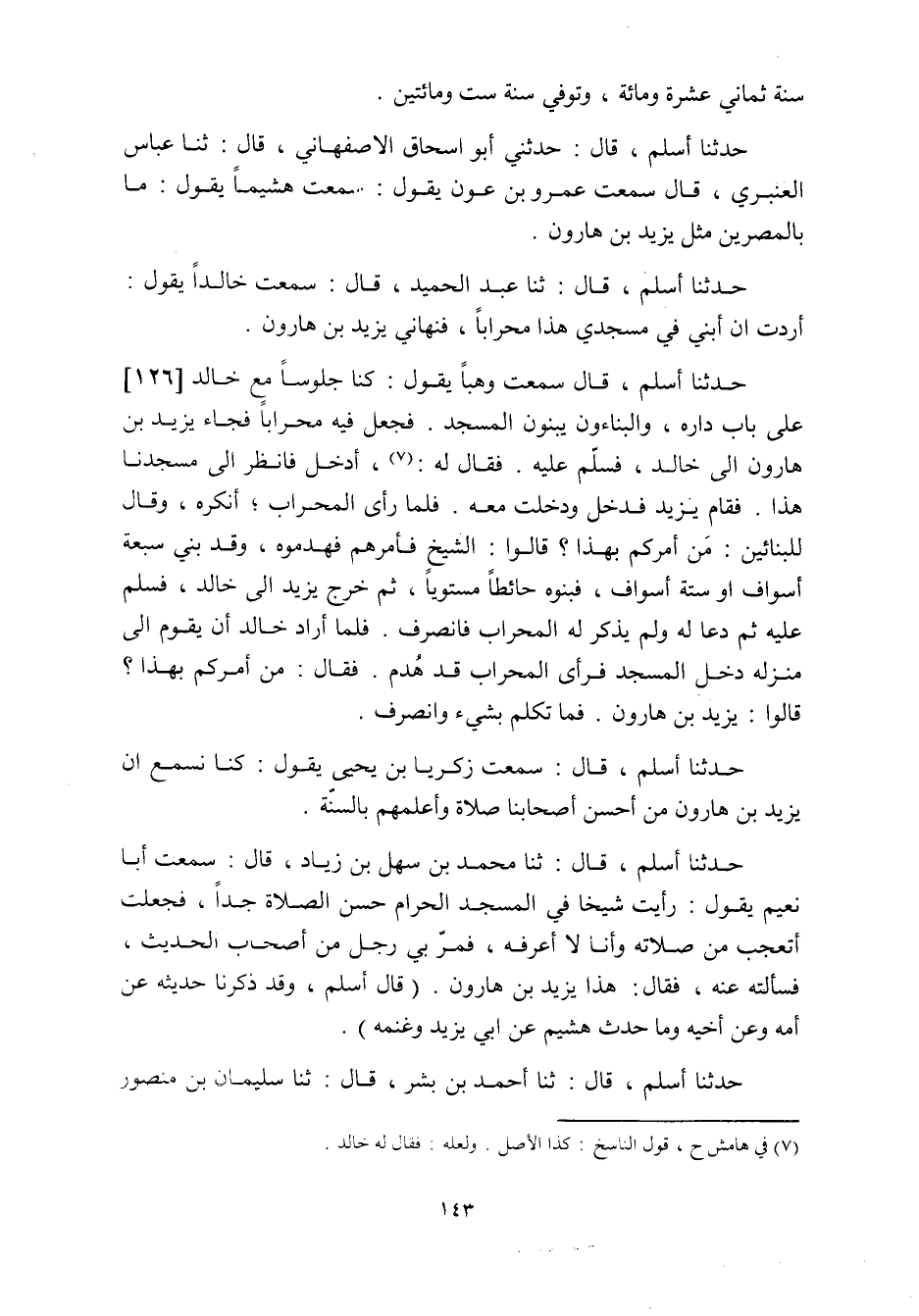 حدثنا أسلم، قَالَ سمعت وهبا يقول: كنا جلوسا مع خالد [126] على باب داره، والبناءون يبنون المسجد. فجعل فيه محرابا فجاء يزيد بن هارون إلى خالد، فسلم عليه. فقال له: «7» ، أدخل فانظر إلى مسجدنا هذا. فقام يزيد فدخل ودخلت معه. فلما رأى المحراب؛ أنكره، وَقَالَ للبنائين: من أمركم بهذا؟ قالوا: الشيخ فأمرهم فهدموه، وقد بني سبعة أسواف أو ستة أسواف، فبنوه حائطا مستويا، ثم خرج يزيد إلى خالد، فسلم عليه ثم دعا له ولم يذكر له المحراب فانصرف. فلما أراد خالد أن يقوم إلى منزله دخل المسجد فرأى المحراب قد هدم. فقال: من أمركم بهذا؟
