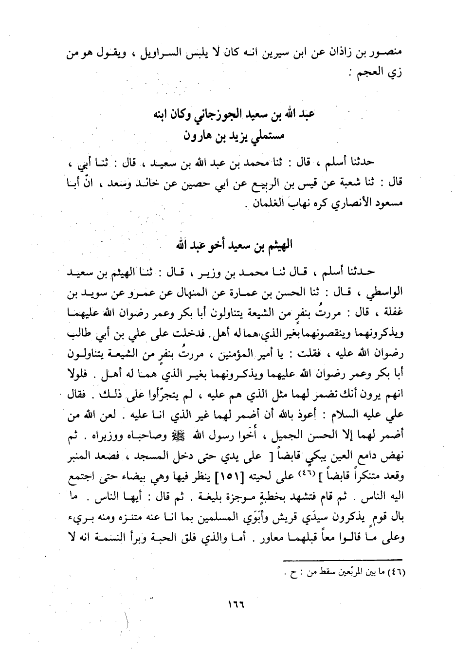 حدثنا أسلم، قال ثنا محمد بن وزير، قال: ثنا الْهَيْثَمُ بْنُ سَعِيدٍ الْوَاسِطِيُّ، قَالَ: ثنا الْحَسَنُ بْنُ عُمَارَةَ عَنِ الْمِنْهَالِ عَنْ عَمْرٍو عَنْ سُوَيْدِ بْنِ غَفَلَةَ، قَالَ: مَرَرْتُ بِنَفَرٍ مِنَ الشِّيعَةِ يَتَنَاوَلُونَ أَبَا بَكْرٍ وَعُمَرَ رِضْوَانُ اللَّهِ عَلَيْهِمَا وَيَذْكُرُونَهُمَا وَيُنْقِصُونَهُمَا بِغَيْرِ الَّذِي هُمَا لَهُ أَهْلٌ. فَدَخَلْتُ عَلَى عَلِيِّ بْنِ أَبِي طَالِبٍ رِضْوَانُ اللَّهِ عَلَيْهِ، فَقُلْتُ: يَا أَمِيرَ الْمُؤْمِنِينَ، مَرَرْتُ بِنَفَرٍ مِنَ الشِّيعَةِ يَتَنَاوَلُونَ أَبَا بَكْرٍ وَعُمَرَ رِضْوَانُ اللَّهِ عَلَيْهِمَا وَيَذْكُرُونَهُمَا بِغَيْرِ الَّذِي هُمَا لَهُ أَهْلٌ. فَلَوْلا أَنَّهُمْ يَرَوْنَ أَنَّكَ تُضْمِرُ لَهُمَا مِثْلَ الَّذِي هُمْ عَلَيْهِ، لَمْ يتجرّأوا عَلَى ذَلِكَ. فَقَالَ عَلِيٌّ عَلَيْهِ السَّلامُ: أَعُوذُ بِاللَّهِ أَنْ أُضْمِرَ لَهُمَا غَيْرَ الَّذِي أَنَا عَلَيْهِ. لَعَنَ اللَّهُ مَنْ أَضْمَرَ لَهُمَا إِلا الْحَسَنَ الْجَمِيلَ، أَخَوَا رَسُولِ اللَّهِ صَلَّى اللَّهُ عَلَيْهِ وَسَلَّمَ وَصَاحِبَاهُ وَوَزِيرَاهُ. ثُمَّ نَهَضَ دَامِعَ الْعَيْنِ يَبْكِي قَابِضًا [عَلَى يَدِي حَتَّى دَخَلَ المسجد، فصعد المنبر وقعد متنكرا قَابِضًا] «46» عَلَى لِحْيَتِهِ [151] يَنْظُرُ فِيهَا وَهِيَ بَيْضَاءُ حَتَّى اجْتَمَعَ إِلَيْهِ النَّاسُ. ثُمَّ قَامَ فَتَشَهَّدَ بِخُطْبَةٍ مُوجَزَةٍ بَلِيغَةٍ. ثُمَّ قَالَ: أَيُّهَا النَّاسُ. مَا بَالُ قَوْمٍ يَذْكُرُونَ سَيِّدَيْ قُرَيْشٍ وَأَبَوَيِ الْمُسْلِمِينَ بِمَا أَنَا عَنْهُ مُتَنَزِّهٌ وَمِنْهُ بَرِيءٌ وعلى ما قالوا معا قبلهما معاور. أَمَا وَالَّذِي فَلَقَ الْحَبَّةَ وَبَرَأَ النَّسَمَةَ إِنَّهُ لا