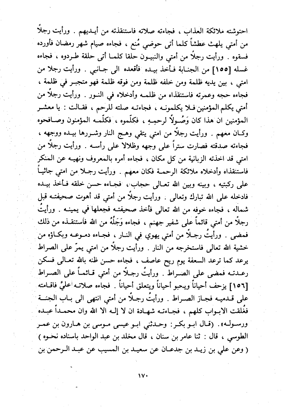احْتَوَشَتْهُ مَلائِكَةُ الْعَذَابِ، فَجَاءَتْهُ صَلاتُهُ فَاسْتَنْقَذَتْهُ مِنْ أَيْدِيهِمْ. وَرَأَيْتُ رَجُلا مِنْ أُمَّتِي يَلْهَثُ عَطَشًا كُلَّمَا أَتَى حَوْضِي مُنِعَ، فَجَاءَهُ صِيَامُ شَهْرِ رَمَضَانَ فَأَوْرَدَهُ فَسَقَوْهُ. وَرَأَيْتُ رَجُلا مِنْ أُمَّتِي وَالنَّبِيُّونَ حَلَقًا كُلَّمَا أَتَى حَلْقَةً طَرَدُوهُ، فَجَاءَهُ غُسْلُهُ [155] مِنَ الْجَنَابَةِ فَأَخَذَ بِيَدِهِ فَأَقْعَدَهُ إِلَى جَانِبِي. وَرَأَيْتُ رَجُلا مِنْ أُمَّتِي، بَيْنَ يَدَيْهِ ظُلْمَةٌ وَمِنْ خَلْفِهِ ظُلْمَةٌ وَمِنْ فَوْقِهِ ظُلْمَةٌ فَهُوَ مُتَجَبِّرٌ فِي ظُلْمِهِ، فَجَاءَهُ حَجُّهُ وَعُمْرَتُهُ فَاسْتَنْقَذَاهُ مِنْ ظُلْمِهِ وَأَدْخَلاهُ فِي النُّورِ. وَرَأَيْتُ رَجُلا مِنْ أُمَّتِي يُكَلِّمُ الْمُؤْمِنِينَ فَلا يُكَلِّمُونَهُ، فَجَاءَتْهُ صِلَتُهُ لِلرَّحِمِ، فَقَالَتْ: يَا مَعْشَرَ الْمُؤْمِنِينَ إِنَّ هَذَا كَانَ وَصُولا لِرَحِمِهِ، فَكَلِّمُوهُ، فَكَلَّمَهُ الْمُؤْمِنُونَ وَصَافَحُوهُ وَكَانَ مَعَهُمْ. وَرَأَيْتُ رَجُلا مِنْ أُمَّتِي يَتَّقِي وَهَجَ النَّارِ وَشَرَرَهَا بِيَدِهِ وَوَجْهِهِ، فَجَاءَتْهُ صَدَقَتُهُ فَصَارَتْ سِتْرًا عَلَى وَجْهِهِ وَظِلالا عَلَى رَأْسِهِ. وَرَأَيْتُ رَجُلا مِنْ أُمَّتِي قَدْ أَخَذَتْهُ الزَّبَانِيَةُ مِنْ كُلِّ مَكَانٍ، فَجَاءَهُ أَمْرُهُ بِالْمَعْرُوفِ وَنَهْيُهُ عَنِ الْمُنْكَرِ فَاسْتَنْقَذَاهُ وَأَدْخَلاهُ مَلائِكَةُ الرَّحْمَةِ فَكَانَ مَعَهُمْ. وَرَأَيْتُ رَجُلا مِنْ أُمَّتِي جَاثِيًا عَلَى رُكْبَتَيْهِ، وَبَيْنَهُ وَبَيْنَ اللَّهِ تَعَالَى حِجَابٌ، فَجَاءَهُ حُسْنُ خُلُقِهِ فَأَخَذَ بِيَدِهِ فَأَدْخَلَهُ عَلَى اللَّهِ تَبَارَكَ وَتَعَالَى. وَرَأَيْتُ رَجُلا مِنْ أُمَّتِي قَدْ أَهْوَتْ صَحِيفَتُهُ قِبَلَ شِمَالِهِ، فَجَاءَهُ خَوْفُهُ مِنَ اللَّهِ تَعَالَى فَأَخَذَ صَحِيفَتَهُ فَجَعَلَهَا فِي يَمِينِهِ. وَرَأَيْتُ رَجُلا مِنْ أُمَّتِي قَائِمًا عَلَى شَفِيرِ جَهَنَّمَ، فَجَاءَهُ وَجَلُهُ مِنَ اللَّهِ فَاسْتَنْقَذَهُ مِنْ ذَلِكَ فَمَضَى. وَرَأَيْتُ رَجُلا مِنْ أُمَّتِي يَهْوِي فِي النَّارِ، فَجَاءَهُ دُمُوعُهُ وَبُكَاؤُهُ مِنْ خَشْيَةِ اللَّهِ تَعَالَى فَاسْتَخْرَجَهُ مِنَ النَّارِ. وَرَأَيْتُ رَجُلا مِنْ أُمَّتِي يَمُرُّ عَلَى الصِّرَاطِ يُرْعَدُ كَمَا تُرْعِدُ السَّعَفَةُ يَوْمَ رِيحٍ عَاصِفٍ، فَجَاءَهُ حُسْنُ ظَنِّهِ بِاللَّهِ تَعَالَى فَسَكَّنَ رَعْدَتَهُ فَمَضَى عَلَى الصِّرَاطِ. وَرَأَيْتُ رَجُلا مِنْ أُمَّتِي قَائِمًا عَلَى الصِّرَاطِ [156] يَزْحَفُ أَحْيَانًا وَيَحْبُو أَحْيَانًا وَيَتَعَلَّقُ أَحْيَانًا. فَجَاءَهُ صَلاتُهُ عَلَيَّ فَأَقَامَتْهُ عَلَى قَدَمَيْهِ فَجَازَ الصِّرَاطَ. وَرَأَيْتُ رَجُلا مِنْ أُمَّتِيَ انْتَهَى إِلَى بَابِ الْجَنَّةِ فَغُلِّقَتِ الأَبْوَابُ كُلُّهُمْ، فَجَاءَتْهُ شَهَادَةُ أَنْ لا إِلَهَ إِلا اللَّهُ وَأَنَّ مُحَمَّدًا عَبْدُهُ وَرَسُولُهُ» . (قَالَ أَبُو بَكْرٍ: وَحَدَّثَنِي أَبُو عِيسَى مُوسَى بْنُ هَارُونَ بْنِ عُمَرَ الطُّوسِيُّ، قَالَ: ثنا عَامِرُ بْنُ سِنَانٍ، قَالَ مَخْلَدُ بْنُ عَبْدِ الْوَاحِدِ بِإِسْنَادِهِ نَحْوَهُ) (وَعَنْ عَلِيِّ بْنِ زَيْدِ بْنِ جُدْعَانَ عَنْ سَعِيدِ بْنِ الْمُسَيِّبِ عَنْ عَبْدِ الرَّحْمَنِ بْنِ