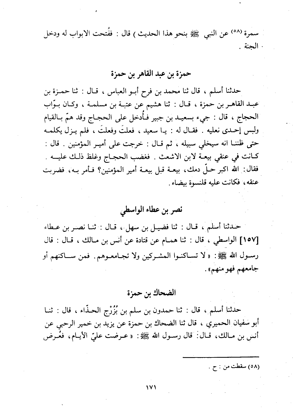 حدثنا أسلم، قَالَ ثنا مُحَمَّد بن فرح أبو العباس، قال: ثنا حمزة بن عبد القاهر بن حمزة، قَالَ: ثنا هشيم عن عتبة بن مسلمة، وكان بواب الحجاج، قَالَ: جيء بسعيد بن جبير فأدخل على الحجاج وقد هم بالقيام ولبس إحدى نعليه. فقال له: يا سعيد، فعلت وفعلت، فلم يزل يكلمه حتى ظننا أنه سيخلي سبيله، ثم قَالَ: خرجت على أمير المؤمنين. قَالَ: