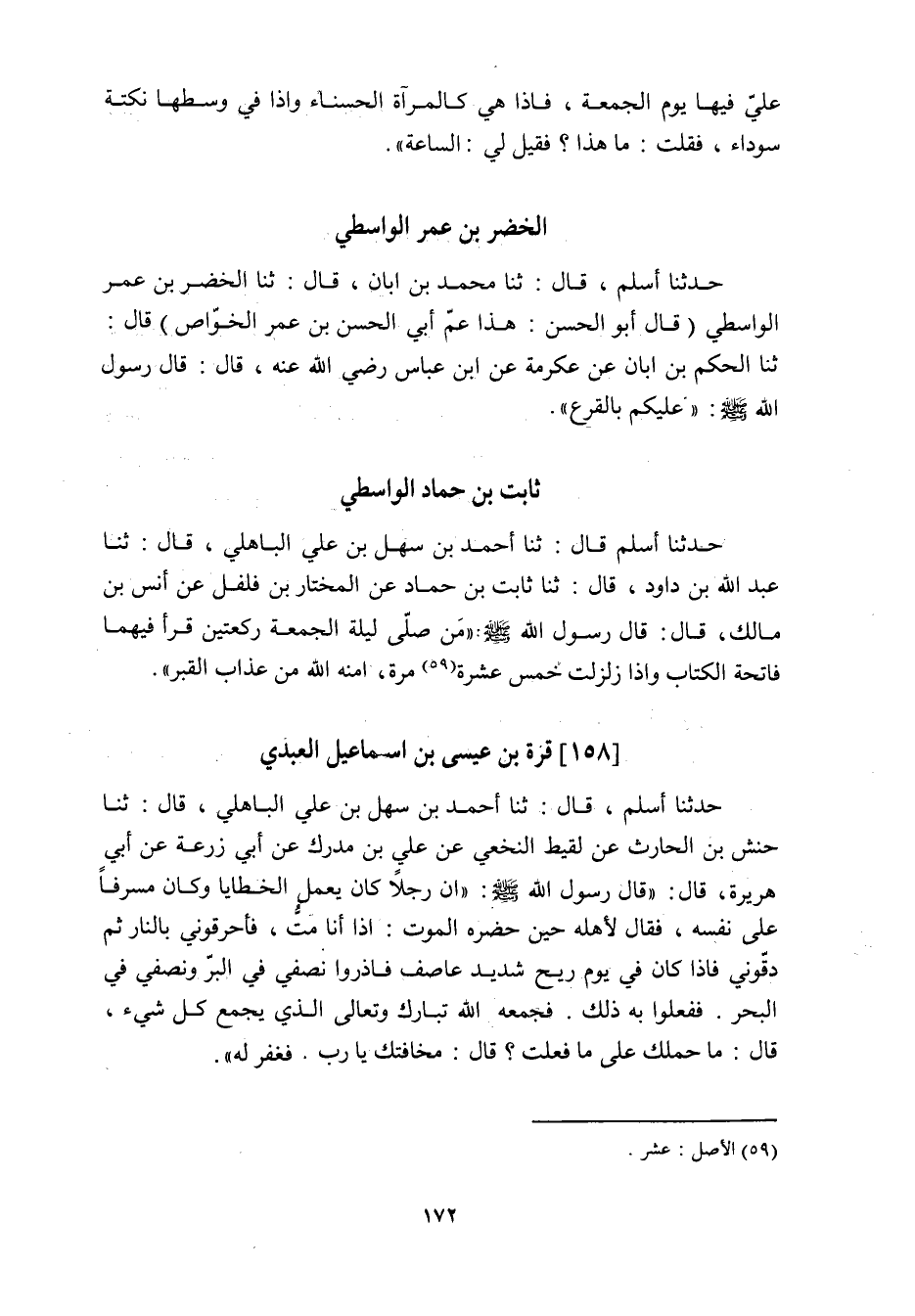 حدثنا أسلم قال: ثنا أحمد بن سهل بن علي الْبَاهِلِيُّ، قَالَ: ثنا عَبْدُ اللَّهِ بْنُ دَاوُدَ، قَالَ: ثنا ثَابِتُ بْنُ حَمَّادٍ عَنِ الْمُخْتَارِ بْنِ فُلْفُلٍ عَنْ أَنَسِ بْنِ مَالِكٍ، قَالَ: قال رسول الله صلى الله عليه وسلم: «مَنْ صَلَّى لَيْلَةَ الْجُمُعَةِ رَكْعَتَيْنِ قَرَأَ فِيهِمَا فاتحة الكتاب واذا زُلْزِلَتِ خَمْسَ عَشْرَةَ «59» مَرَّةً، أَمَّنَهُ اللَّهُ مِنْ عذاب القبر» .