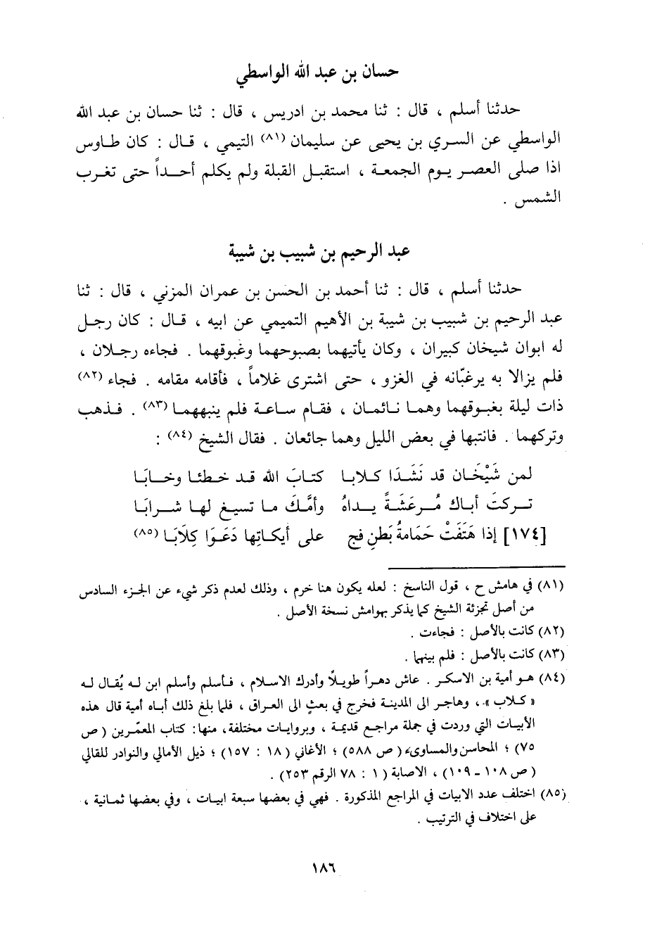 حدثنا أسلم، قَالَ: ثنا أَحْمَدُ بْنُ الْحَسَنِ بْنِ عِمْرَانَ الْمُزَنِيُّ، قَالَ: ثنا عَبْدُ الرَّحِيمِ بْنُ شَبِيبِ بْنِ شَيْبَةَ بْنِ الأَهْيَمِ التَّمِيمِيُّ عَنْ أَبِيهِ، قَالَ: كَانَ رَجُلٌ لَهُ أَبَوَانِ شَيْخَانِ كَبِيرَانِ، وَكَانَ يَأْتِيهِمَا بِصَبُوحِهِمَا وَغَبُوقِهِمَا. فَجَاءَهُ رَجُلانِ، فَلَمْ يَزَالا بِهِ يُرَغِّبَانِهِ فِي الْغَزْوِ، حَتَّى اشْتَرَى غُلامًا، فَأَقَامَهُ مَقَامَهُ. فَجَاءَ «82» ذَاتَ لَيْلَةٍ بِغَبُوقِهِمَا وَهُمَا نَائِمَانِ، فَقَامَ سَاعَةً فَلَمْ يُنَبِّهْهُمَا «83» . فَذَهَبَ وَتَرَكَهُمَا. فَانْتَبَهَا فِي بَعْضِ اللَّيْلِ وَهُمَا جَائِعَانِ. فَقَالَ الشَّيْخُ «84» :