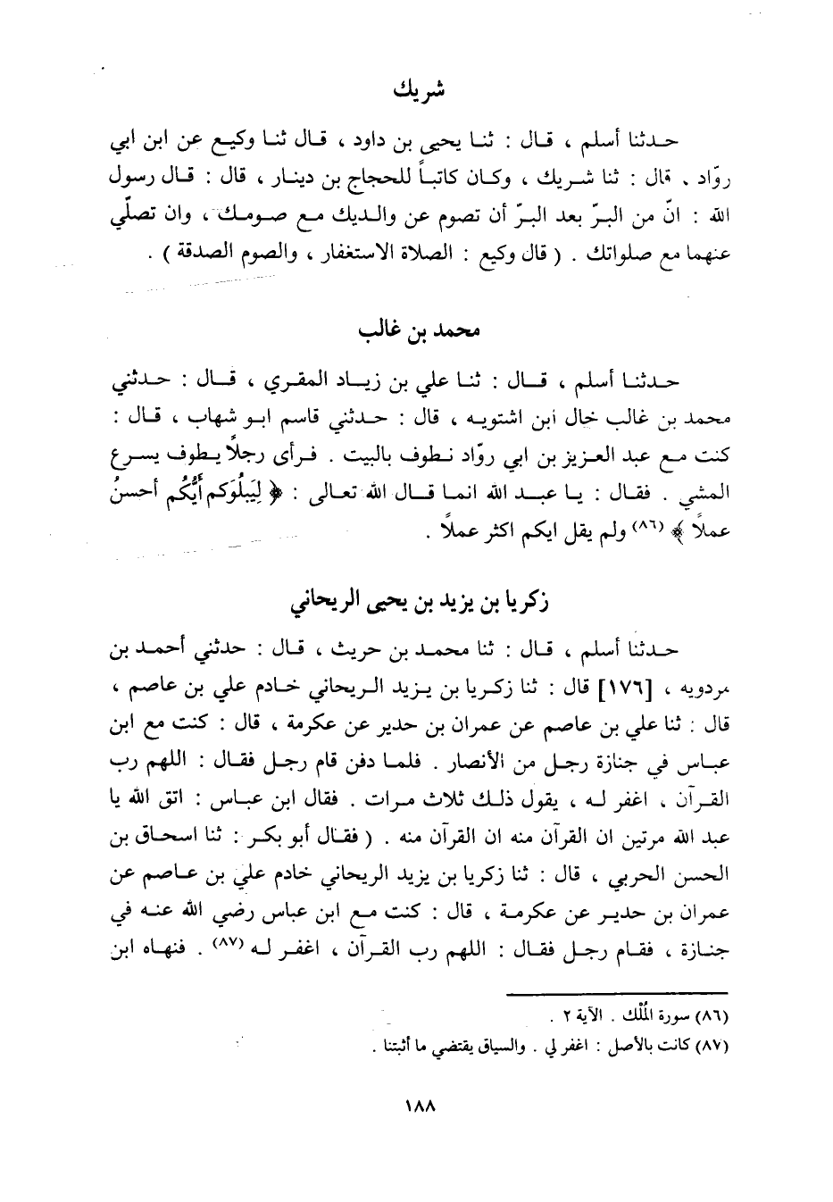 حدثنا أسلم، قَالَ: ثنا مُحَمَّدُ بْنُ حُرَيْثٍ، قَالَ: حَدَّثَنِي أَحْمَدُ بْنُ مَرْدَوَيْهِ، [176] قَالَ: ثنا زَكَرِيَّا بْنُ يَزِيدَ الرَّيْحَانِيُّ خَادِمُ عَلِيِّ بْنِ عَاصِمٍ، قَالَ: ثنا عَلِيُّ بْنُ عَاصِمٍ عَنْ عِمْرَانَ بْنِ حُدَيْرٍ عَنْ عِكْرِمَةَ، قَالَ: كُنْتُ مَعَ ابْنِ عَبَّاسٍ فِي جَنَازَةِ رَجُلٍ مِنَ الأَنْصَارِ. فَلَمَّا دُفِنَ قَامَ رَجُلٌ فَقَالَ: اللَّهُمَّ رَبَّ الْقُرْآنِ، اغْفِرْ لَهُ، يَقُولُ ذَلِكَ ثَلاثَ مَرَّاتٍ. فَقَالَ ابْنُ عَبَّاسٍ: اتَّقِ اللَّهَ يَا عَبْدَ اللَّهِ مَرَّتَيْنِ إِنَّ الْقُرْآنَ مِنْهُ إِنَّ الْقُرْآنَ مِنْهُ. (فَقَالَ أَبُو بَكْرٍ: ثنا إِسْحَاقُ بْنُ الْحَسَنِ الْحَرْبِيُّ، قَالَ: ثنا زَكَرِيَّا بْنُ يَزِيدَ الرَّيْحَانِيُّ خَادِمُ عَلِيِّ بْنِ عَاصِمٍ عَنْ عِمْرَانَ بْنِ حُدَيْرٍ عَنْ عِكْرِمَةَ، قَالَ: كُنْتُ مَعَ ابْنِ عَبَّاسٍ رَضِيَ اللَّهُ عَنْهُ فِي جَنَازَةٍ، فَقَامَ رَجُلٌ فَقَالَ: اللَّهُمَّ رَبَّ الْقُرْآنِ، اغْفِرْ لَهُ «87» . فنهاه ابن