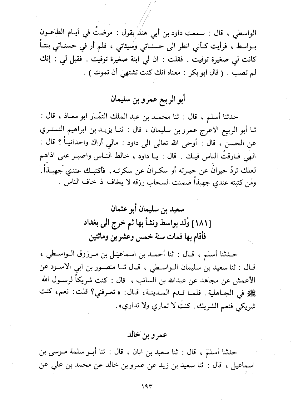 سعيد بن سليمان أبو عثمان [181] ولد بواسط ونشأ بها ثم خرج إلى بغداد فأقام بها فمات سنة خمس وعشرين ومائتين