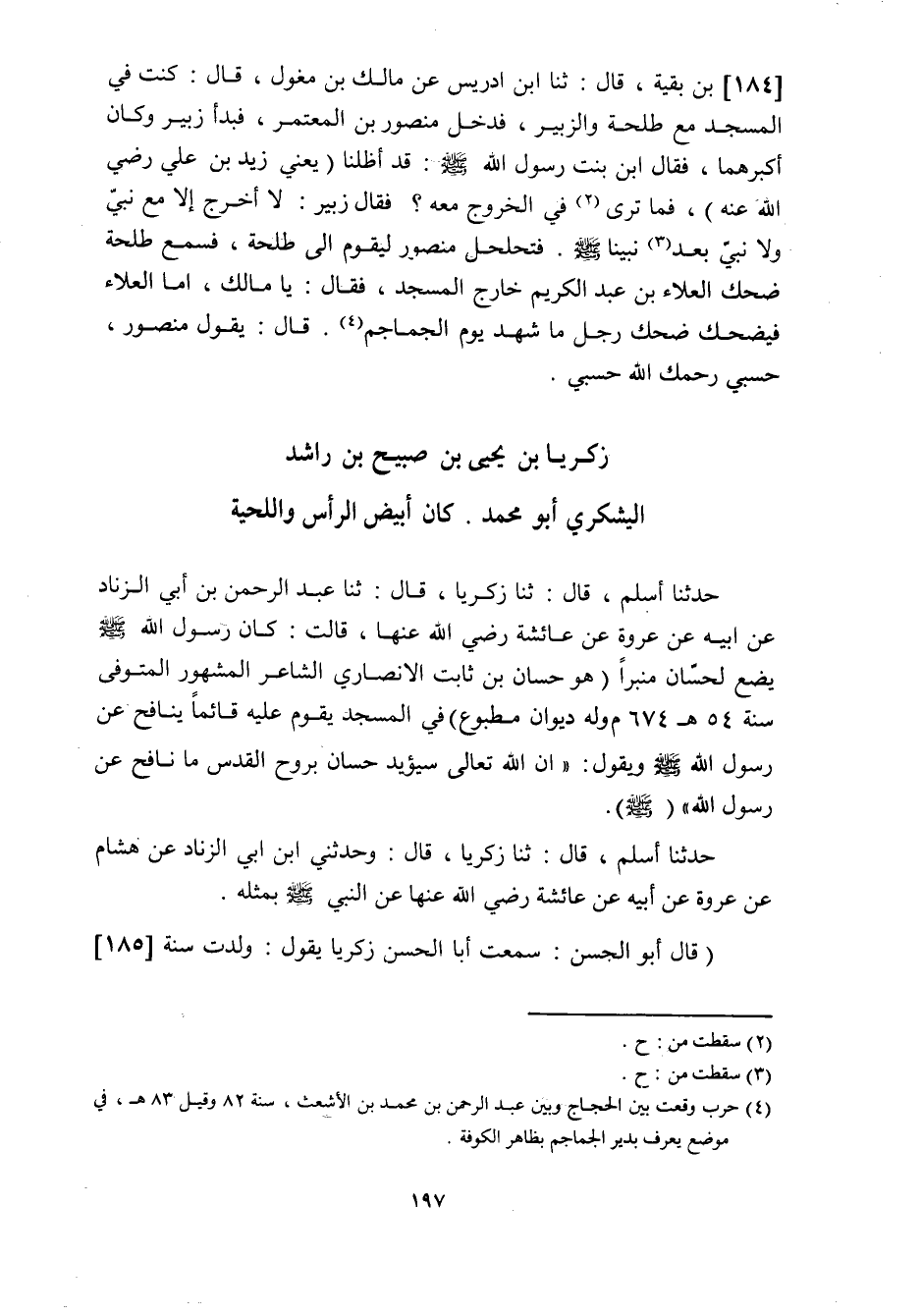 [184] بْنُ بَقِيَّةَ، قَالَ: ثنا ابْنُ إِدْرِيسَ عَنْ مَالِكِ بْنِ مِغْوَلٍ، قَالَ: كُنْتُ فِي الْمَسْجِدِ مَعَ طَلْحَةَ وَالزُّبَيْرِ، فَدَخَلَ مَنْصُورُ بْنُ الْمُعْتَمِرِ، فبدأ زبير وَكَانَ أَكْبَرَهُمَا، فَقَالَ ابْنُ بِنْتِ رَسُولِ اللَّهِ صَلَّى اللَّهُ عَلَيْهِ وَسَلَّمَ: قَدْ أَظَلَّنَا (يَعْنِي زَيْدَ بْنَ عَلِيٍّ رَضِيَ اللَّهُ عَنْهُ) ، فَمَا تَرَى «2» فِي الْخُرُوجِ مَعَهُ؟ فَقَالَ زُبَيْرٌ: لا أَخْرُجُ إِلا مَعَ نَبِيٍّ وَلا نَبِيَّ بَعْدَ «3» نَبِيِّنَا صَلَّى اللَّهُ عَلَيْهِ وَسَلَّمَ. فَتَحَلْحَلَ مَنْصُورٌ لِيَقُومَ إِلَى طَلْحَةَ، فَسَمِعَ طَلْحَةُ ضَحِكَ الْعَلاءِ بْنِ عَبْدِ الْكَرِيمِ خَارِجَ الْمَسْجِدِ، فَقَالَ: يَا مَالِكُ، أَمَّا الْعَلاءُ فَيَضْحَكُ ضَحِكَ رَجُلٍ مَا شَهِدَ يَوْمَ الْجَمَاجِمِ «4» . قَالَ: يَقُولُ مَنْصُورٌ، حَسْبِي رَحِمَكَ اللَّهُ حَسْبِي.