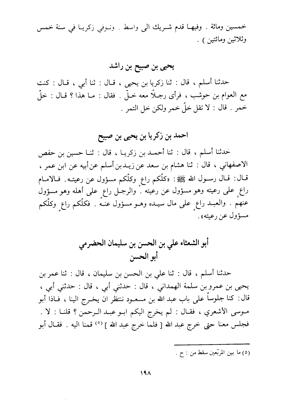حدثنا أسلم، قَالَ: ثنا أَحْمَدُ بْنُ زَكَرِيَّا، قَالَ: ثنا حُسَيْنُ بْنُ حَفْصٍ الأَصْفَهَانِيُّ، قَالَ: ثنا هِشَامُ بْنُ سَعْدٍ عَنْ زَيْدِ بْنِ أَسْلَمَ عَنْ أَبِيهِ عَنِ ابْنِ عُمَرَ، قَالَ: قَالَ رَسُولُ اللَّهِ صَلَّى اللَّهُ عَلَيْهِ وَسَلَّمَ: «كُلُّكُمْ رَاعٍ وَكُلُّكُمْ مَسْئُولٌ عَنْ رَعِيَّتِهِ. فَالإِمَامُ رَاعٍ عَلَى رَعِيَّتِهِ وَهُوَ مَسْئُولٌ عَنْ رَعِيَّتِهِ. وَالرَّجُلُ رَاعٍ عَلَى أَهْلِهِ وَهُوَ مَسْئُولٌ عَنْهُمْ. وَالْعَبْدُ رَاعٍ عَلَى مَالِ سَيِّدِهِ وَهُوَ مَسْئُولٌ عَنْهُ. فَكُلُّكُمْ رَاعٍ وَكُلُّكُمْ مَسْئُولٌ عَنْ رَعِيَّتِهِ» .