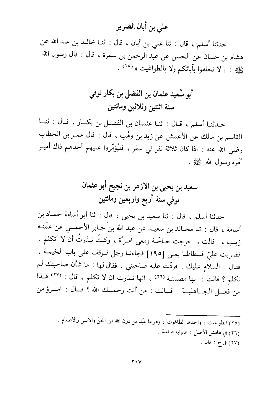 حدثنا أسلم، قَالَ: ثنا عَلِيُّ بْنُ أَبَانَ، قَالَ: ثنا خَالِدُ بْنُ عَبْدِ اللَّهِ عَنْ هِشَامِ بْنِ حَسَّانٍ عَنِ الْحَسَنِ عَنْ عَبْدِ الرَّحْمَنِ بْنِ سَمُرَةَ، قَالَ: قَالَ رَسُولُ اللَّهِ صَلَّى اللَّهُ عَلَيْهِ وَسَلَّمَ: «لا تَحْلِفُوا بِآبَائِكُمْ وَلا بِالطَّوَاغِيتِ» «25» .