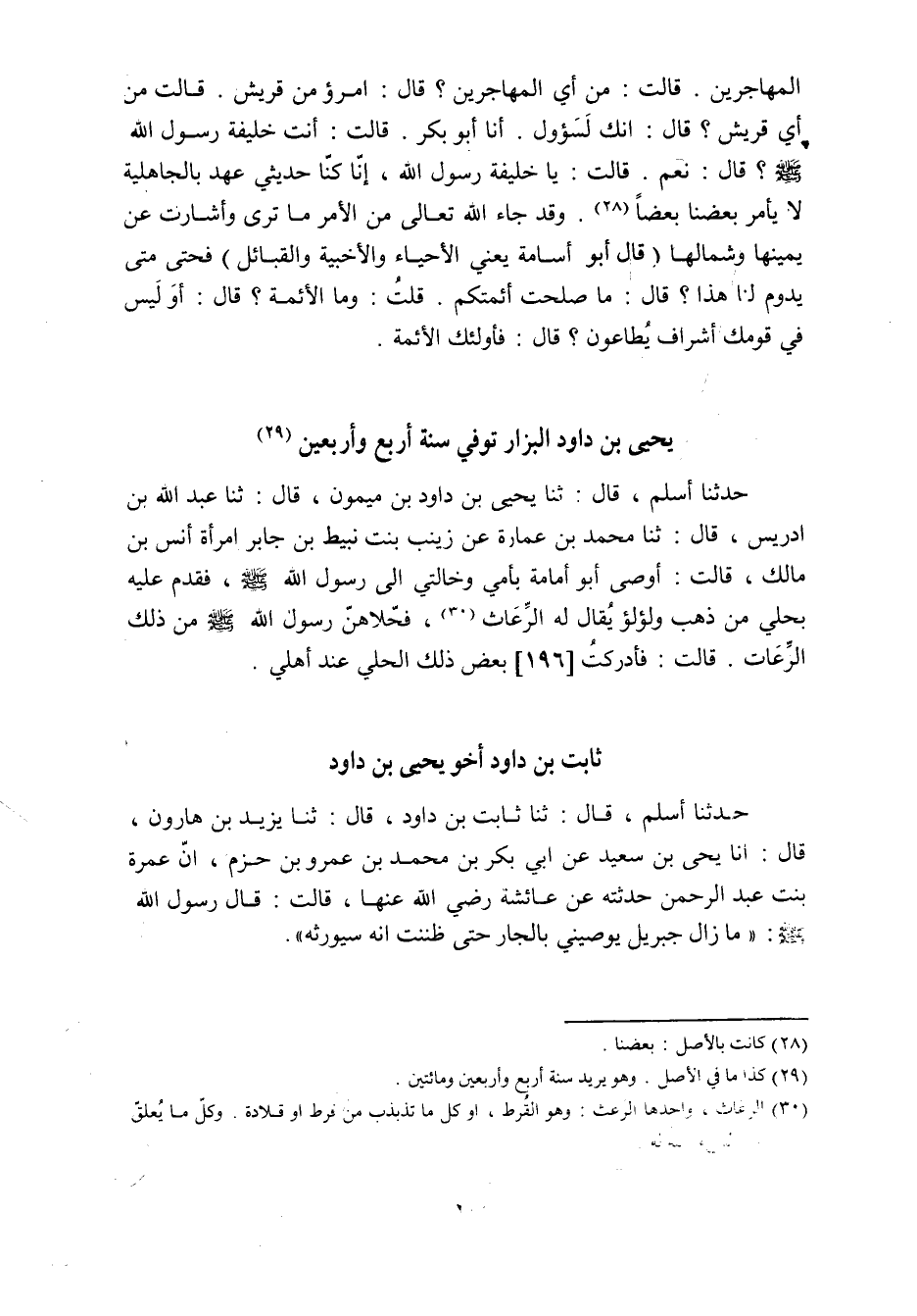 حدثنا أسلم، قَالَ: ثنا يَحْيَى بْنُ دَاوُدَ بْنِ مَيْمُونٍ، قَالَ: ثنا عَبْدُ اللَّهِ بْنُ إِدْرِيسَ، قَالَ: ثنا مُحَمَّدُ بْنُ عُمَارَةَ عَنْ زَيْنَبَ بِنْتِ نُبَيْطِ بْنِ جَابِرٍ امْرَأَةِ أَنَسِ بْنِ مَالِكٍ، قَالَتْ: أَوْصَى أَبُو أُمَامَةَ بِأُمِّي وَخَالَتِي إِلَى رَسُولِ اللَّهِ صَلَّى اللَّهُ عَلَيْهِ وَسَلَّمَ، فَقُدِمَ عَلَيْهِ بِحُلِيٍّ مِنْ ذَهَبٍ وَلُؤْلُؤٍ يُقَالُ لَهُ الرِّعَاثُ «30» ، فَحَلاهُنَّ رَسُولُ اللَّهِ صَلَّى اللَّهُ عَلَيْهِ وسلم من ذلك الرّعات. قَالَتْ: فَأَدْرَكْتُ [196] بَعْضَ ذَلِكَ الْحُلِيِّ عِنْدَ أَهْلِي.