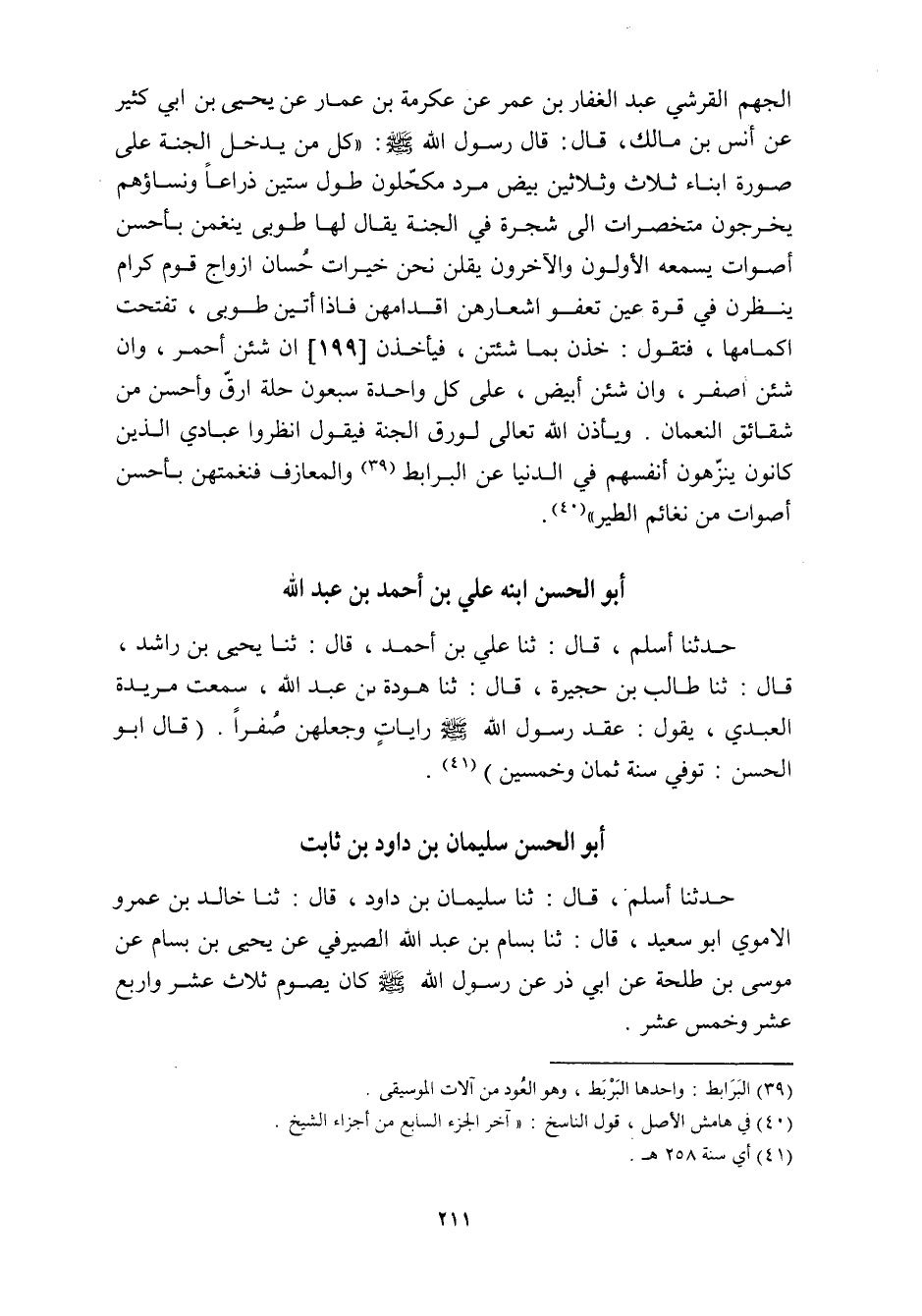 الْجَهْمِ الْقُرَشِيُّ عَبْدُ الْغَفَّارِ بْنُ عُمَرَ عَنْ عِكْرِمَةَ بْنِ عَمَّارٍ عَنْ يَحْيَى بْنِ أَبِي كَثِيرٍ عَنْ أَنَسِ بْنِ مَالِكٍ، قَالَ: قَالَ رَسُولُ اللَّهِ صَلَّى اللَّهُ عَلَيْهِ وَسَلَّمَ: «كُلُّ مَنْ يَدْخُلُ الْجَنَّةَ عَلَى صُورَةِ أَبْنَاءِ ثَلاثٍ وَثَلاثِينَ بِيضٌ مُرْدٌ مُكَحَّلُونَ طُولُ سِتِّينَ ذِرَاعًا وَنِسَاؤُهُمْ يَخْرُجُونَ مُتَخَصِّرَاتٍ إِلَى شَجَرَةٍ فِي الْجَنَّةِ يُقَالُ لَهَا طُوبَى يُنَغِّمْنَ بِأَحْسَنِ أَصْوَاتٍ يَسْمَعُهُ الأَوَّلُونَ وَالآخِرُونَ يَقُلْنَ نَحْنُ خَيْرَاتٌ حِسَانٌ أَزْوَاجُ قَوْمٍ كِرَامٍ يَنْظُرْنَ فِي قُرَّةِ عَيْنٍ تَعْفُو أَشْعَارُهُنَّ أَقْدَامَهُنَّ فَإِذَا أَتَيْنَ طُوبَى، تَفَتَّحَتْ أَكْمَامُهَا، فَتَقُولُ: خُذْنَ بِمَا شِئْتُنَّ، فَيَأْخُذْنَ [199] إِنْ شِئْنَ أَحْمَرَ، وَإِنْ شِئْنَ أَصْفَرَ، وَإِنْ شِئْنَ أَبْيَضَ، عَلَى كُلِّ وَاحِدَةٍ سَبْعُونَ حُلَّةً أَرَقَّ وَأَحْسَنَ مِنْ شَقَائِقِ النُّعْمَانِ. وَيَأْذَنُ اللَّهُ تَعَالَى لِوَرَقِ الجنة فيقول انظروا عبادي الذين كانون يُنَزِّهُونَ أَنْفُسَهُمْ فِي الدُّنْيَا عَنِ الْبَرَابِطِ «39» وَالْمَعَازِفِ فَنَغَمَتُهُنَّ بِأَحْسَنِ أَصْوَاتٍ مِنْ نَغَائِمِ الطَّيْرِ» «40» .