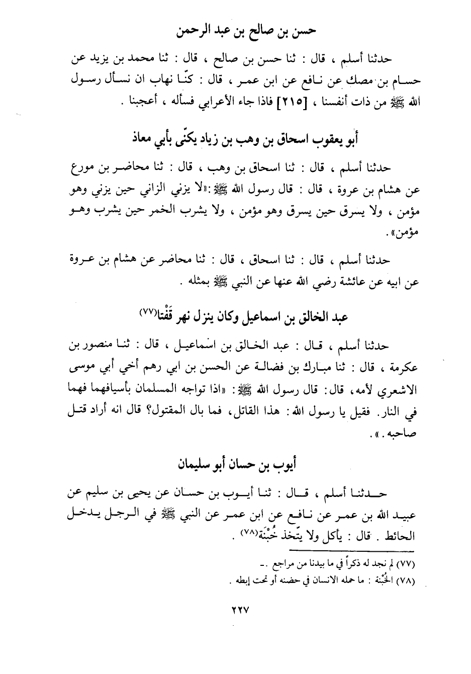 حدثنا أسلم، قَالَ: ثنا حَسَنُ بْنُ صَالِحٍ، قَالَ: ثنا مُحَمَّدُ بْنُ يَزِيدَ عَنْ حُسَامِ بْنِ مِصَكٍّ عَنْ نَافِعٍ عَنِ ابْنِ عُمَرَ، قَالَ: كُنَّا نَهَابُ أَنْ نَسْأَلَ رَسُولَ اللَّهِ صَلَّى اللَّهُ عَلَيْهِ وَسَلَّمَ مِنْ ذَاتِ أَنْفُسِنَا، [215] فَإِذَا جَاءَ الأَعْرَابِيُّ فَسَأَلَهُ، أَعْجَبَنَا.