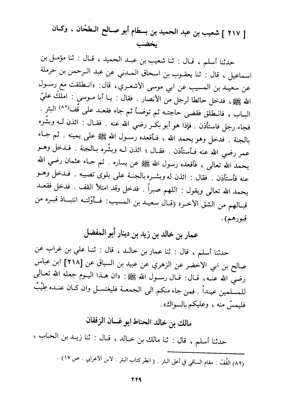 حدثنا أسلم، قَالَ: ثنا شُعَيْبُ بْنُ عَبْدِ الْحَمِيدِ، قَالَ: ثنا مُؤَمَّلُ بْنُ إِسْمَاعِيلَ، قَالَ: ثنا يَعْقُوبُ بْنُ إِسْحَاقَ الْمَدَنِيُّ عَنْ عَبْدِ الرَّحْمَنِ بْنِ حَرْمَلَةَ عَنْ سَعِيدِ بْنِ الْمُسَيِّبِ عَنْ أَبِي مُوسَى الأَشْعَرِيِّ، قَالَ: «انْطَلَقْتُ مَعَ رَسُولِ اللَّهِ صَلَّى اللَّهُ عَلَيْهِ وَسَلَّمَ، فَدَخَلَ حَائِطًا لِرَجُلٍ مِنَ الأَنْصَارِ. فَقَالَ: يَا أَبَا مُوسَى: امْلُكْ عَلَيَّ الْبَابَ، فَانْطَلَقَ فَقَضَى حَاجَتَهُ ثُمَّ تَوَضَّأَ ثُمَّ جَاءَ فَقَعَدَ عَلَى قُفِّ «82» الْبِئْرِ.