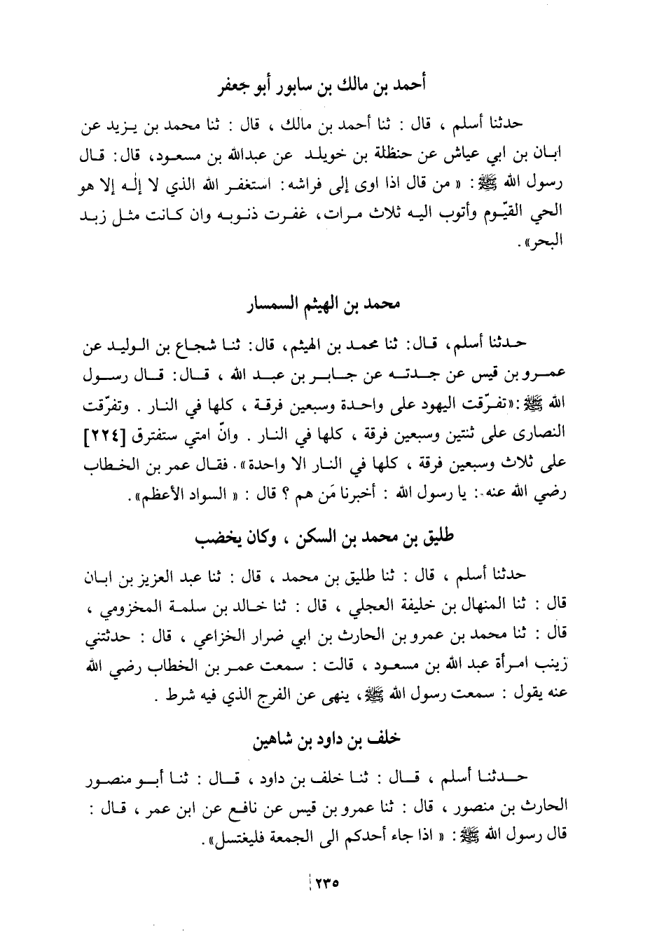 حدثنا أسلم، قَالَ: ثنا مُحَمَّدُ بْنُ الْهَيْثَمِ، قَالَ: ثنا شُجَاعُ بْنُ الْوَلِيدِ عَنْ عَمْرِو بْنِ قَيْسٍ عَنْ جَدَّتِهِ عَنْ جَابِرِ بْنِ عَبْدِ اللَّهِ، قَالَ: قَالَ رَسُولُ اللَّهِ صَلَّى اللَّهُ عَلَيْهِ وَسَلَّمَ: «تَفَرَّقَتِ الْيَهُودُ عَلَى وَاحِدَةٍ وَسَبْعِينَ فِرْقَةً، كُلُّهَا فِي النَّارِ. وَتَفَرَّقَتِ النَّصَارَى عَلَى ثِنْتَيْنِ وَسَبْعِينَ فِرْقَةً، كُلُّهَا فِي النَّارِ. وَإِنَّ أُمَّتِي سَتَفْتَرِقُ [224] عَلَى ثَلاثٍ وَسَبْعِينَ فِرْقَةً، كُلُّهَا فِي النَّارِ إِلا وَاحِدَةً» . فَقَالَ عُمَرُ بْنُ الْخَطَّابِ رَضِيَ اللَّهُ عَنْهُ: يَا رَسُولَ اللَّهِ: أَخْبِرْنَا مَنْ هُمْ؟ قَالَ: «السَّوَادُ الأَعْظَمُ» .