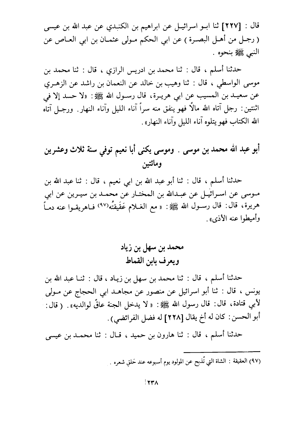 حدثنا أسلم، قَالَ: ثنا مُحَمَّدُ بْنُ إِدْرِيسَ الرَّازِيُّ، قَالَ: ثنا مُحَمَّدُ بْنُ مُوسَى الْوَاسِطِيُّ، قَالَ: ثنا وُهَيْبُ بْنُ خَالِدٍ عَنِ النُّعْمَانِ بْنِ رَاشِدٍ عَنِ الزُّهْرِيِّ عَنْ سَعِيدِ بْنِ الْمُسَيِّبِ عَنْ أَبِي هُرَيْرَةَ، قَالَ رَسُولُ اللَّهِ صَلَّى اللَّهُ عَلَيْهِ وَسَلَّمَ: «لا حَسَدَ إِلا فِي اثْنَتَيْنِ: رَجُلٌ آتَاهُ اللَّهُ مَالا فَهُوَ يُنْفِقُ مِنْهُ سِرًّا آنَاءَ اللَّيْلِ وَآنَاءَ النَّهَارِ. وَرَجُلٌ آتَاهُ اللَّهُ الْكِتَابَ فَهُوَ يَتْلُوهُ آنَاءَ اللَّيْلِ وَآنَاءَ النَّهَارِ» .