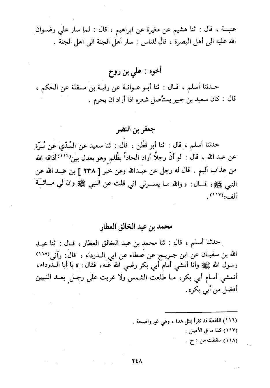 حدثنا أسلم، قَالَ: ثنا أَبُو قَطَنٍ، قَالَ: ثنا سَعِيدٌ عَنِ السُّدِّيِّ عَنْ مُرَّةَ عَنْ عَبْدِ اللَّهِ، قَالَ: لَوْ أَنَّ رَجُلا أَرَادَ إِلْحَادًا بِظُلْمٍ وهو يعدل بين «116» أَذَاقَهُ اللَّهُ مِنْ عَذَابٍ أَلِيمٍ. قَالَ لَهُ رَجُلٌ عَنْ عَبْدِ اللَّهِ وَعَنْ خَيْرِ [238] بْنِ عَبْدِ اللَّهِ عَنِ النَّبِيِّ صَلَّى اللَّهُ عَلَيْهِ وَسَلَّمَ، قَالَ: «وَاللَّهِ مَا يَسُرُّنِي أَنِّي قُلْتُ عَنِ النَّبِيِّ صَلَّى اللَّهُ عَلَيْهِ وَسَلَّمَ وَأَنَّ لِي مِائَةَ أَلْفٍ» «117» .