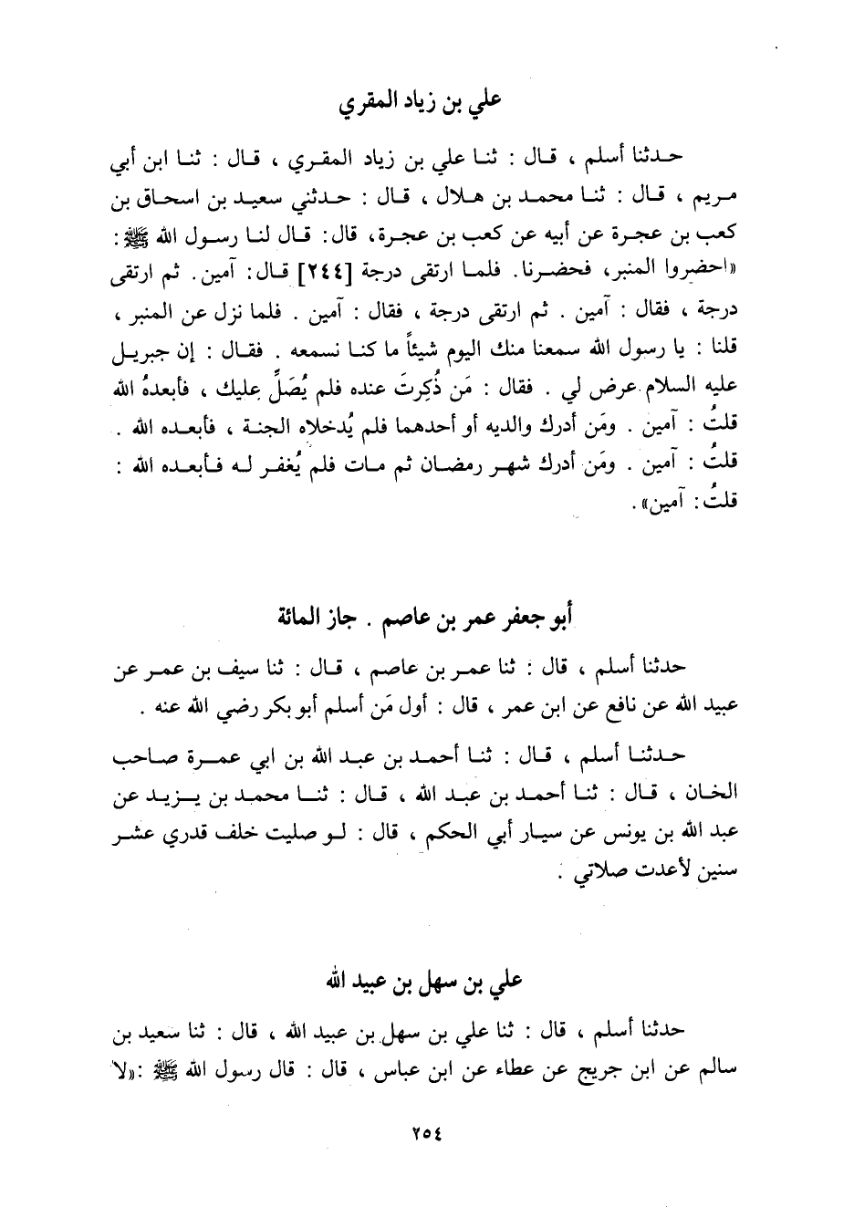 «احْضَرُوا الْمِنْبَرَ، فَحَضَرْنَا. فَلَمَّا ارْتَقَى دَرَجَةً [244] قَالَ: آمِينَ. ثُمَّ ارْتَقَى دَرَجَةً، فَقَالَ: آمِينَ. ثُمَّ ارْتَقَى دَرَجَةً، فَقَالَ: آمِينَ. فَلَمَّا نَزَلَ عَنِ الْمِنْبَرِ، قُلْنَا: يَا رَسُولَ اللَّهِ سَمِعْنَا مِنْكَ الْيَوْمَ شَيْئًا مَا كُنَّا نَسْمَعُهُ. فَقَالَ: إِنَّ جِبْرِيلَ عَلَيْهِ السَّلامُ عَرَضَ لِي. فَقَالَ: مَنْ ذُكِرْتَ عِنْدَهُ فَلَمْ يُصَلِّ عَلَيْكَ، فَأَبْعَدَهُ اللَّهُ قُلْتُ: آمِينَ. وَمَنْ أَدْرَكَ وَالِدَيْهِ أَوْ أَحَدَهُمَا فَلَمْ يُدْخِلاهُ الْجَنَّةَ، فَأَبْعَدَهُ اللَّهُ.