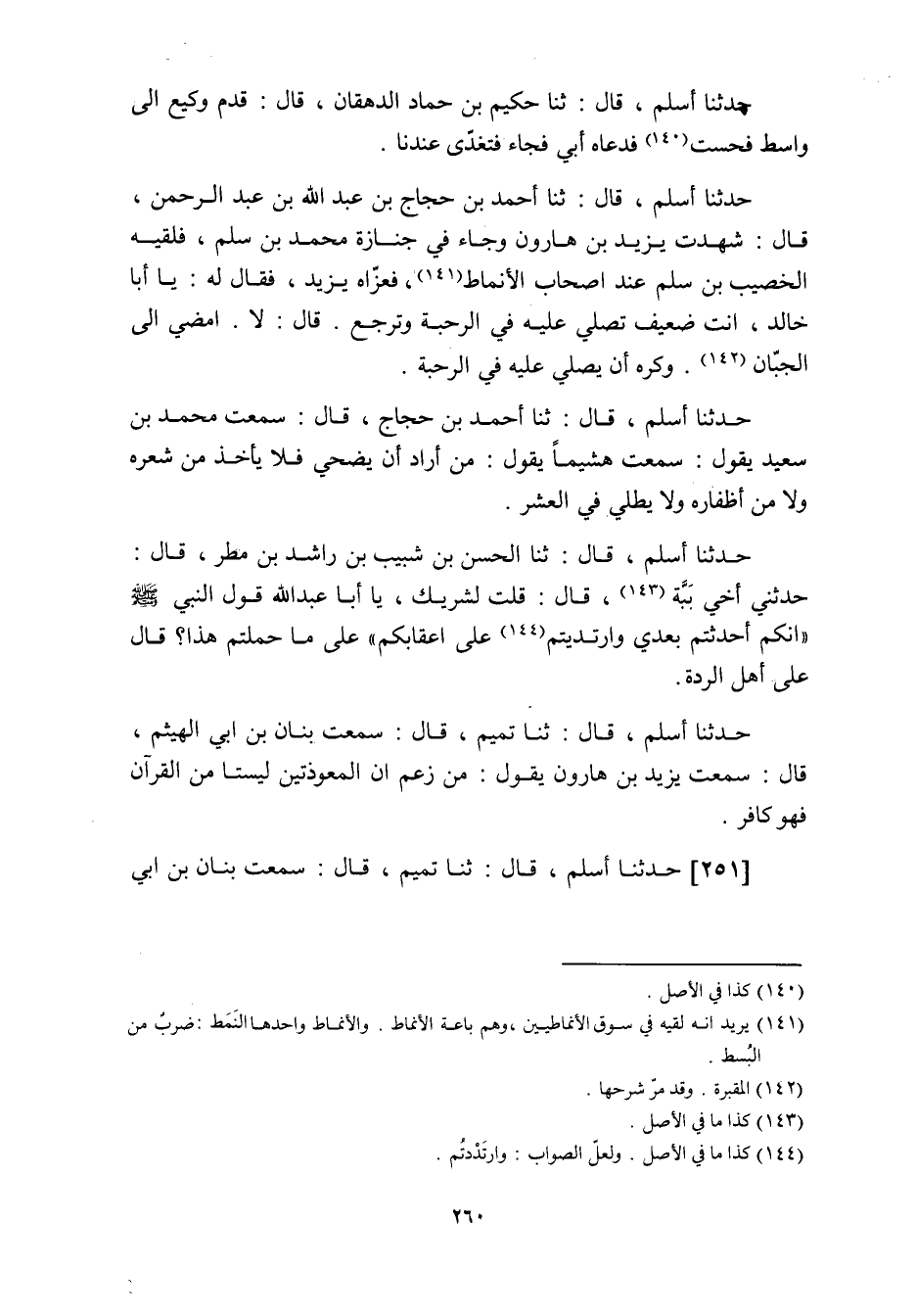 حدثنا أسلم، قَالَ: ثنا تميم، قَالَ: سمعت بنان بن أبي الهيثم، قَالَ: سمعت يزيد بن هارون يقول: من زعم أن المعوذتين ليستا من القرآن فهو كافر.