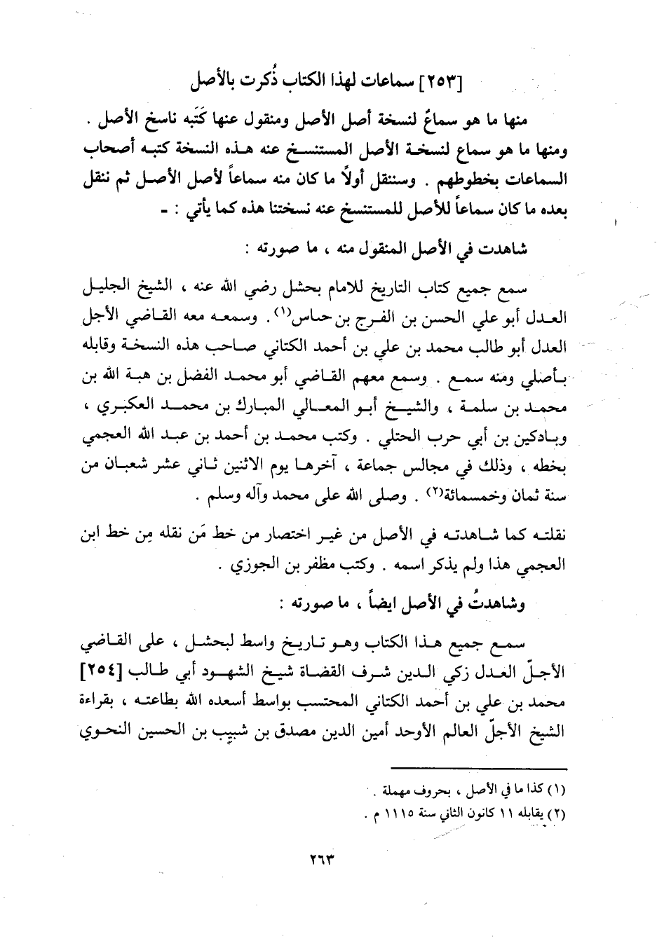 ومنها ما هو سماع لنسخة الأصل المستنسخ عنه هذه النسخة كتبه أصحاب السماعات بخطوطهم. وسننقل أولا ما كان منه سماعا لأصل الأصل ثم ننقل بعده ما كان سماعا للأصل للمستنسخ عنه نسختنا هذه كما يأتي: -