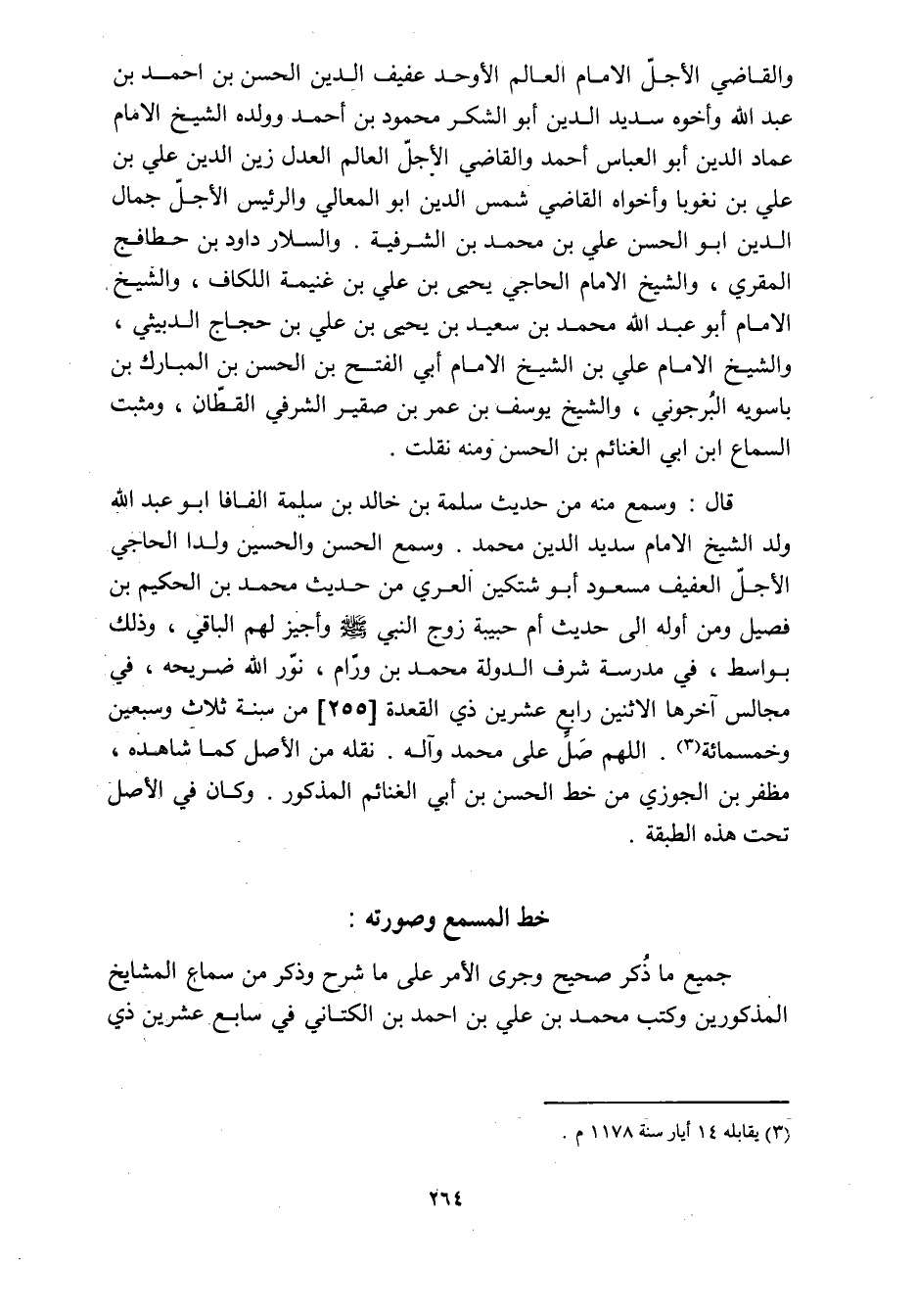 والقاضي الأجلّ الامام العالم الأوحد عفيف الدين الحسن بن احمد بن عبد الله وأخوه سديد الدين أبو الشكر محمود بن أحمد وولده الشيخ الامام عماد الدين أبو العباس أحمد والقاضي الأجلّ العالم العدل زين الدين علي بن علي بن نغوبا وأخواه القاضي شمس الدين ابو المعالي والرئيس الأجلّ جمال الدين ابو الحسن علي بن محمد بن الشرفية. والسلار داود بن حطافج المقري، والشيخ الامام الحاجي يحيى بن علي بن غنيمة اللكاف، والشيخ الامام أبو عبد الله محمد بن سعيد بن يحيى بن علي بن حجاج الدبيثي، والشيخ الامام علي بن الشيخ الامام أبي الفتح بن الحسن بن المبارك بن باسويه البرجوني، والشيخ يوسف بن عمر بن صقير الشرفي القطّان، ومثبت السماع ابن ابي الغنائم بن الحسن ومنه نقلت.