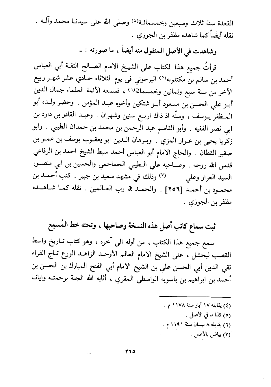 قرأت جميع هذا الكتاب على الشيخ الامام الصالح الثقة أبي العباس أحمد بن سالم بن مكتلو؟؟؟ «5» البرجوني في يوم الثلاثاء حادي عشر شهر ربيع الآخر من سنة سبع وثمانين وخمسمائة «6» ، فسمعه الأئمة العلماء جمال الدين أبو علي الحسن بن مسعود أبو شتكين وأخوه عبد المؤمن. وحضر ولده أبو المظفر يوسف، وسنّه اذ ذاك اربع سنين وشهران. وعبد القادر بن داود بن ابي نصر الفقيه. وأبو القاسم عبد الرحمن بن محمد بن حمدان الطيبي. وابو زكريا يحيى بن عرار المزي. وبرهان الدين ابو يعقوب يوسف بن عمر بن صقير القطان. والحاج الامام أبو العباس أحمد سبط الشيخ احمد بن الرفاعي قدس الله روحه. وصاحبه علي الطيبي الحماحمي والحسين بن ابي منصور السيد العرار وعلي «7» وذلك في مشهد سعيد بن جبير. كتب أحمد بن محمود بن أحمد [256] . والحمد لله رب العالمين. نقله كما شاهده مظفر بن الجوزي.