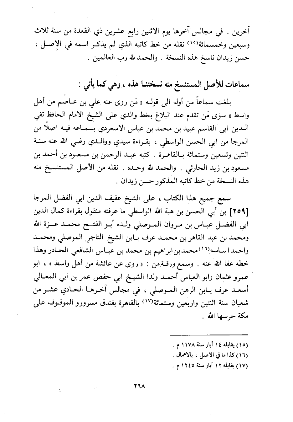 بلغت سماعا من أوله الى قوله «من روى عنه علي بن عاصم من أهل واسط» سوى من تقدم عند البلاغ بخط والدي على الشيخ الامام الحافظ تقي الدين ابي القاسم عبيد بن محمد بن عباس الاسعردي بسماعه فيه اصلا من المرجا من ابي الحسن الواسطي، بقراءة سيدي ووالدي رضي الله عنه سنة اثنتين وتسعين وستمائة بالقاهرة. كتبه عبد الرحمن بن مسعود بن أحمد بن مسعود بن زيد الحارثي. والحمد لله وحده. نقله من الأصل المستنسخ منه هذه النسخة من خط كاتبه المذكور حسن زيدان.