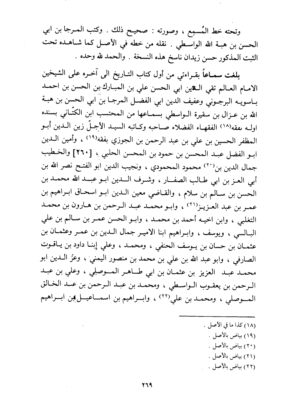 بلغت سماعا بقراءتي من أول كتاب التاريخ الى آخره على الشيخين الامام العالم تقي الدين ابي الحسن علي بن المبارك بن الحسن بن احمد باسويه البرجوني وعفيف الدين ابي الفضل المرجا بن ابي الحسن بن هبة الله بن عزال بن سقيرة الواسطي بسماعها من المحتسب ابن الكتّاني بسنده اوله نفقه «18» الفقهاء الفضلاء صاحبه وكاتبه السيد الأجلّ زين الدين أبو المظفر الحسين بن علي بن عبد الرحمن بن الجوزي بفقه «19» ، وأمين الدين ابو الفضل عبد المحسن بن حمود بن المحسن الحلبي، [260] والخطيب جمال الدين بن «20» محمود المحمودي، ونجيب الدين ابو الفتح نصر الله بن أبي العز بن ابي طالب الصفار، وشرف الدين ابو عبد الله محمد بن الحسن بن سالم بن سلام، والقاضي معين الدين ابو اسحاق ابراهيم بن عمر بن عبد العزيز «21» ، وابو محمد عبد الرحمن بن هارون بن محمد التغلبي، وابن اخيه أحمد بن محمد، وابو الحسن عمر بن سالم بن علي البالسي، ويوسف، وابراهيم ابنا الامير جمال الدين بن عمر وعثمان بن عثمان بن حسان بن يوسف الحنفي، ومحمد، وعلي ابنا داود بن ياقوت الصارفي، وابو عبد الله بن علي بن محمد بن منصور اليمني، وعزّ الدين ابو محمد عبد العزيز بن عثمان بن ابي طاهر الموصلي، وعلي بن عبد الرحمن بن يعقوب الواسطي، ومحمد بن عبد الرحمن بن عبد الخالق الموصلي، ومحمد بن علي «22» ، وابراهيم بن اسماعيل بن ابراهيم