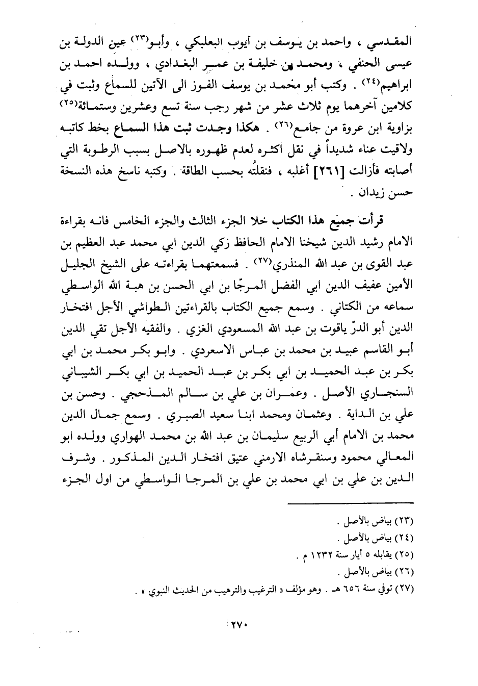 قرأت جميع هذا الكتاب خلا الجزء الثالث والجزء الخامس فانه بقراءة الامام رشيد الدين شيخنا الامام الحافظ زكي الدين ابي محمد عبد العظيم بن عبد القوى بن عبد الله المنذري «27» . فسمعتهما بقراءته على الشيخ الجليل الأمين عفيف الدين ابي الفضل المرجّا بن ابي الحسن بن هبة الله الواسطي سماعه من الكتاني. وسمع جميع الكتاب بالقراءتين الطواشي الأجل افتخار الدين أبو الدرّ ياقوت بن عبد الله المسعودي الغزي. والفقيه الأجل تقي الدين أبو القاسم عبيد بن محمد بن عباس الاسعردي. وابو بكر محمد بن ابي بكر بن عبد الحميد بن ابي بكر بن عبد الحميد بن ابي بكر الشيباني السنجاري الأصل. وعمران بن علي بن سالم المذحجي. وحسن بن علي بن الداية. وعثمان ومحمد ابنا سعيد الصبري. وسمع جمال الدين محمد بن الامام أبي الربيع سليمان بن عبد الله بن محمد الهواري وولده ابو المعالي محمود وسنقر شاه الارمني عتيق افتخار الدين المذكور. وشرف الدين بن علي بن ابي محمد بن علي بن المرجا الواسطي من اول الجزء