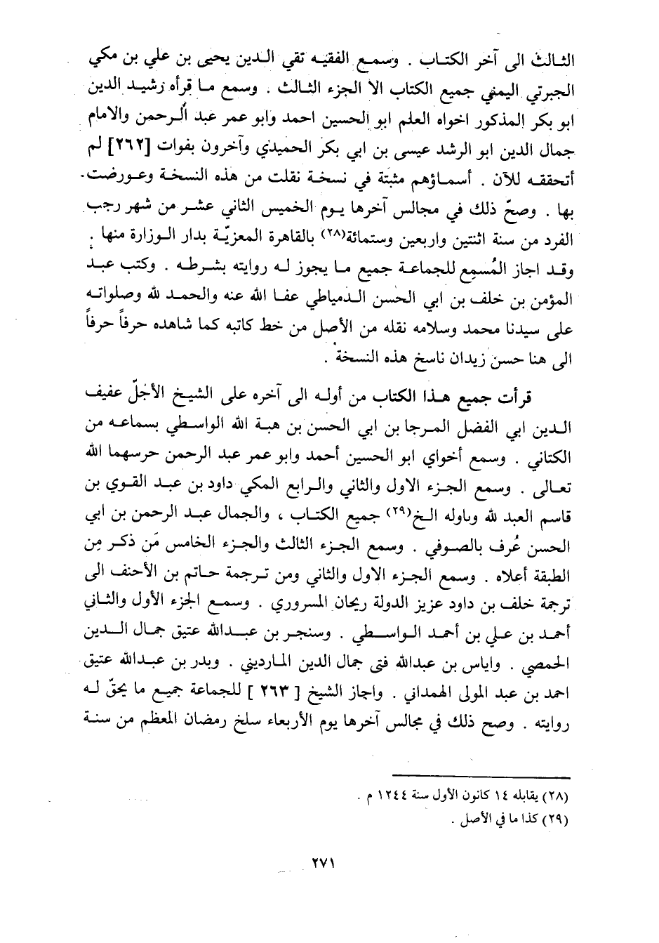 قرأت جميع هذا الكتاب من أوله الى آخره على الشيخ الأجلّ عفيف الدين ابي الفضل المرجا بن ابي الحسن بن هبة الله الواسطي بسماعه من الكتاني. وسمع أخواي ابو الحسين أحمد وابو عمر عبد الرحمن حرسهما الله تعالى. وسمع الجزء الاول والثاني والرابع المكي داود بن عبد القوي بن قاسم العبد لله و؟؟؟ وله الخ «29» جميع الكتاب، والجمال عبد الرحمن بن ابي الحسن عرف بالصوفي. وسمع الجزء الثالث والجزء الخامس من ذكر من الطبقة أعلاه. وسمع الجزء الاول والثاني ومن ترجمة حاتم بن الأحنف الى ترجمة خلف بن داود عزيز الدولة ريحان المسروري. وسمع الجزء الأول والثاني أحمد بن علي بن أحمد الواسطي. وسنجر بن عبد الله عتيق جمال الدين الحمصي. واياس بن عبد الله فتى جمال الدين المارديني. وبدر بن عبد الله عتيق احمد بن عبد المولى الهمداني. واجاز الشيخ [263] للجماعة جميع ما يحقّ له روايته. وصح ذلك في مجالس آخرها يوم الأربعاء سلخ رمضان المعظم من سنة
