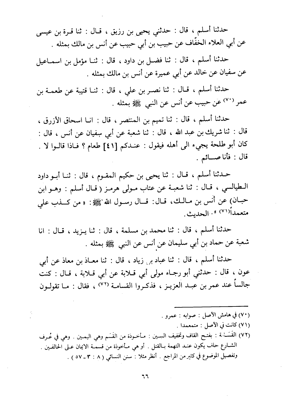 حدثنا أسلم، قَالَ: ثنا يَحْيَى بْنُ حَكِيمٍ الْمُقَوِّمُ، قَالَ: ثنا أَبُو دَاوُدَ الطَّيَالِسِيُّ، قَالَ: ثنا شُعْبَةُ عن عتاب مولى هرمز (قال أسلم: وَهُوَ ابْنُ حَبَّانَ) عَنْ أَنَسِ بْنِ مَالِكٍ، قَالَ: قَالَ رَسُولُ اللَّهِ صَلَّى اللَّهُ عَلَيْهِ وسلم: «من كذب علي متعمدا «71» » . الحديث.
